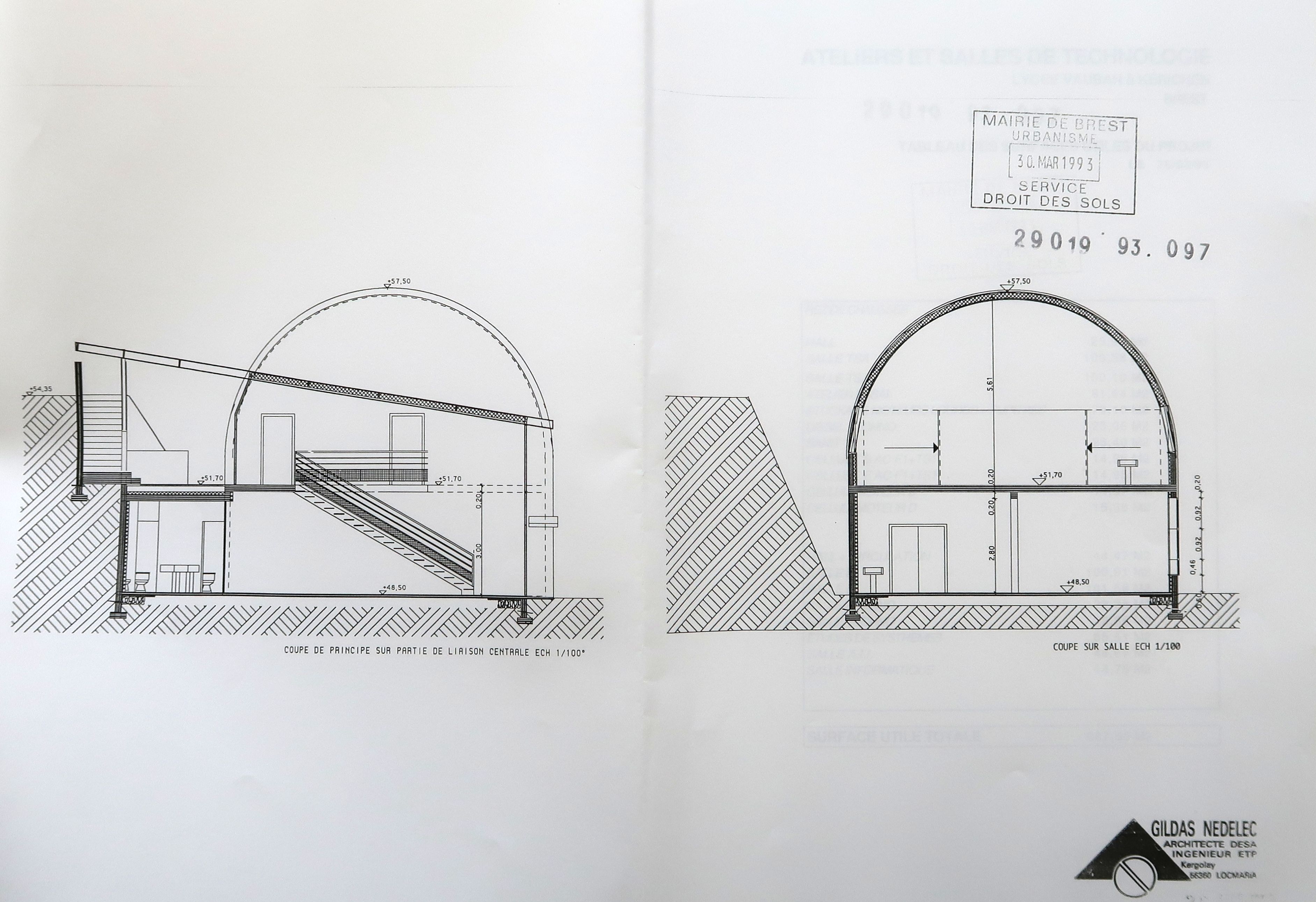 Ateliers et salles de technologie, coupes. Gildas Neédélec, architecte, 26 mars 1993.Immatriculation