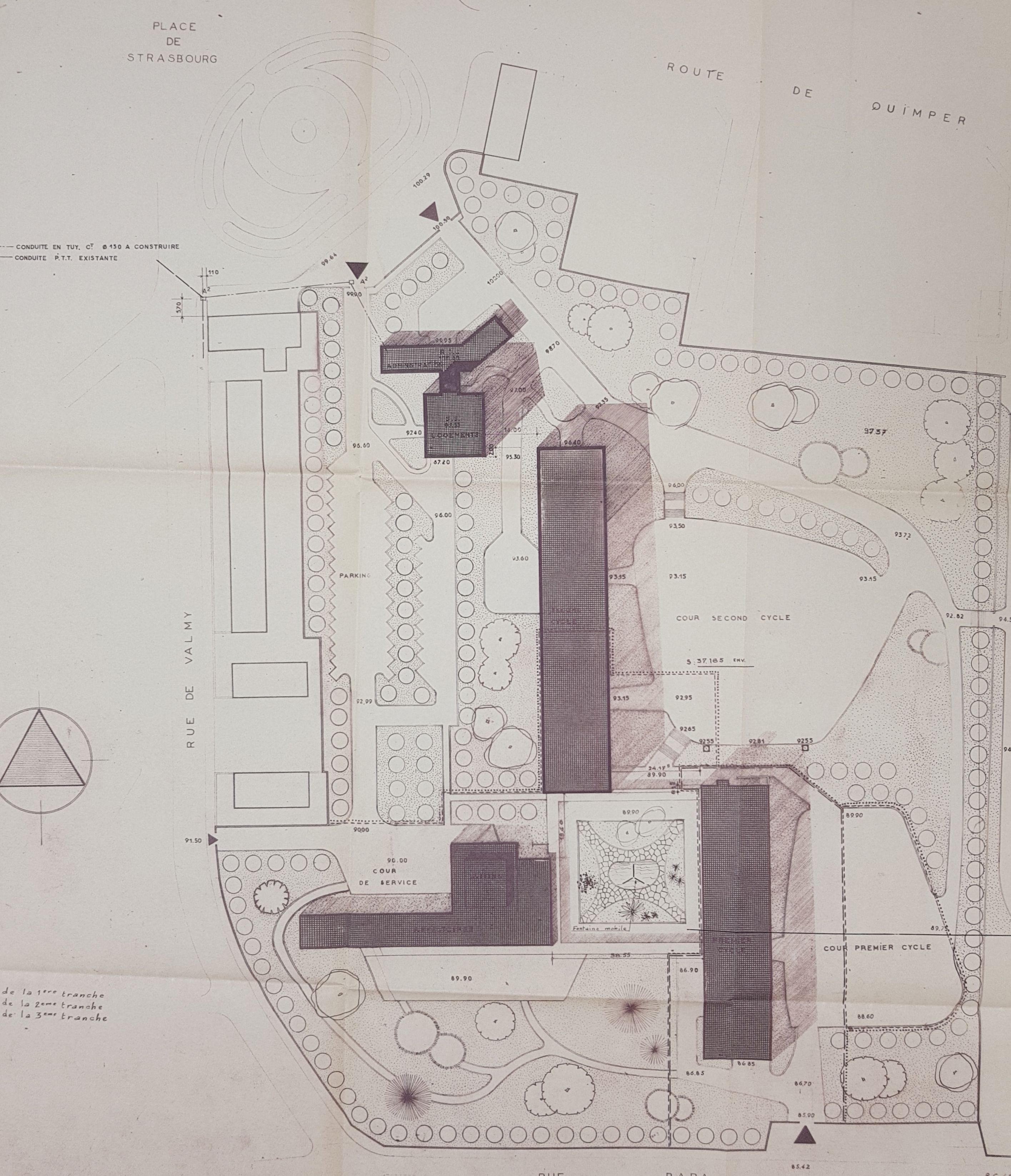 Détail du "Plan de masse", 8e modification du 9/12/1970, indiquant l'emplacement de la "fontaine mobile". Jean Lacaille, architecte.Immatriculation