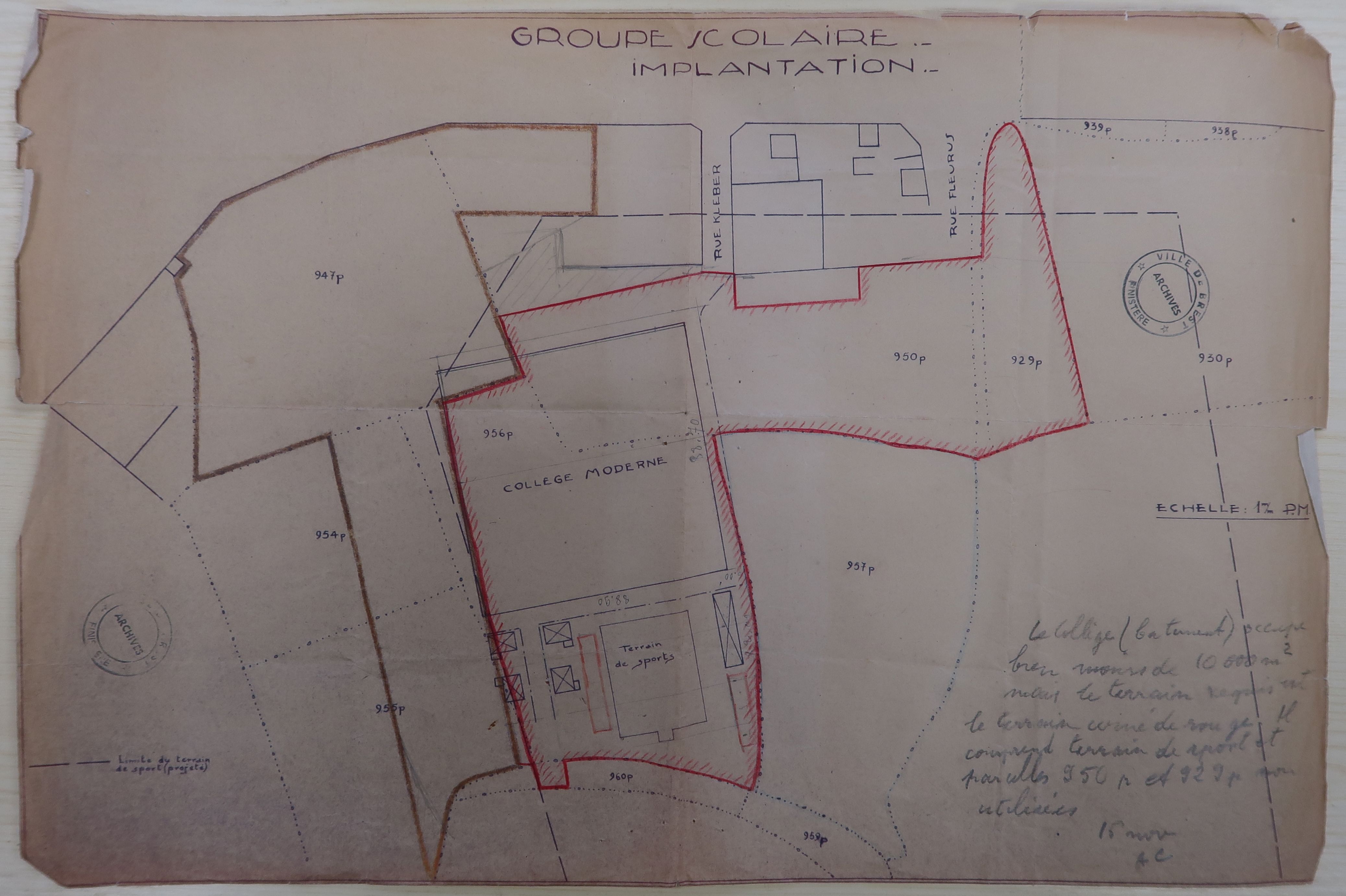 Plan du collège moderne en baraques. Groupe scolaire. Implantation. "Le collège (bâtiment) occupe bien moins de10000 m2 mais le terrain requis est le terrain cerné de rouge. Il comprend le terrain de sport et parcelles 950 p et 929 p non utilisées".Immatriculation