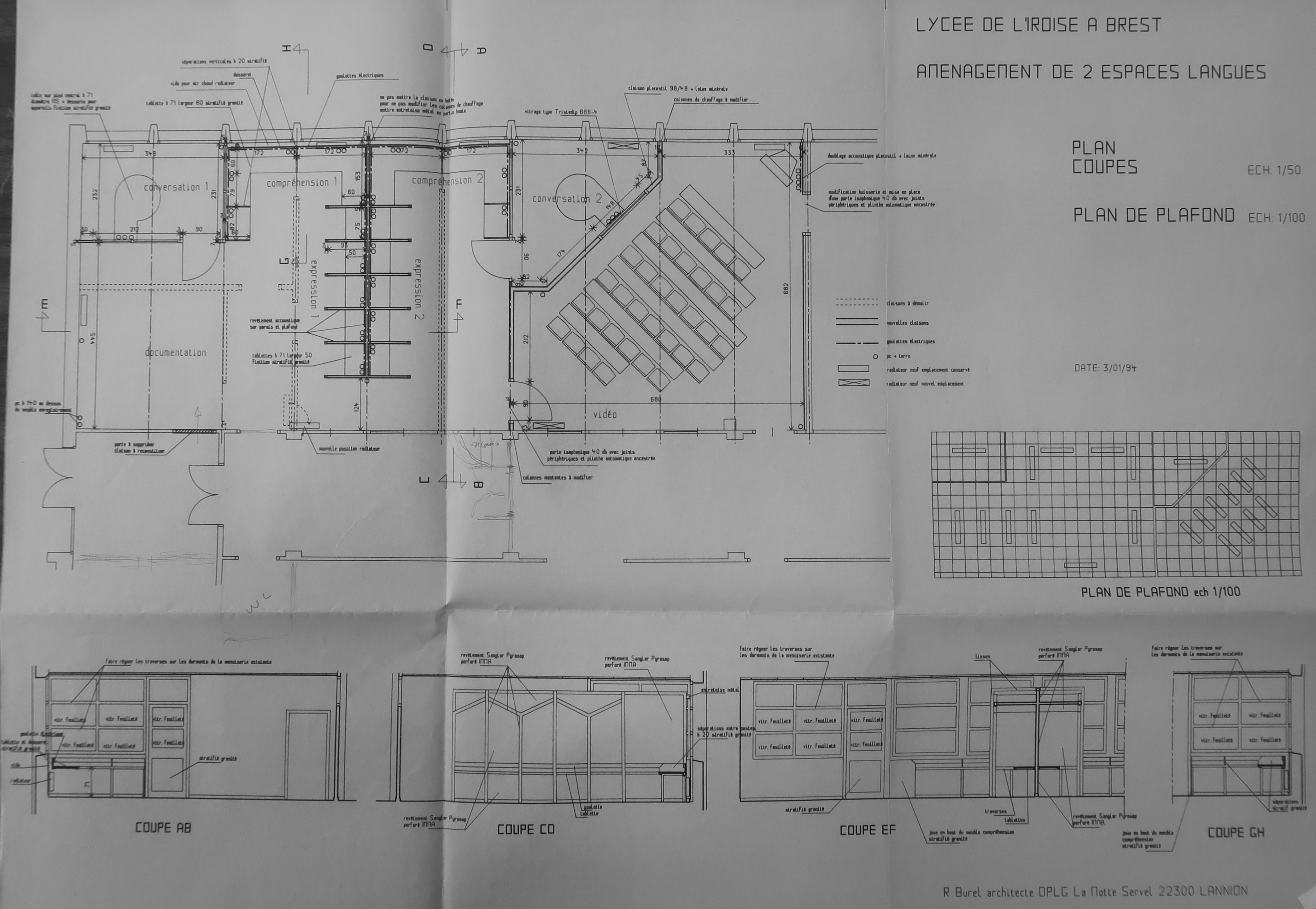 Aménagement de deux espaces langues. Plans, coupes, plans de plafond. René Burel, architecte, vers 1992-1994.Immatriculation