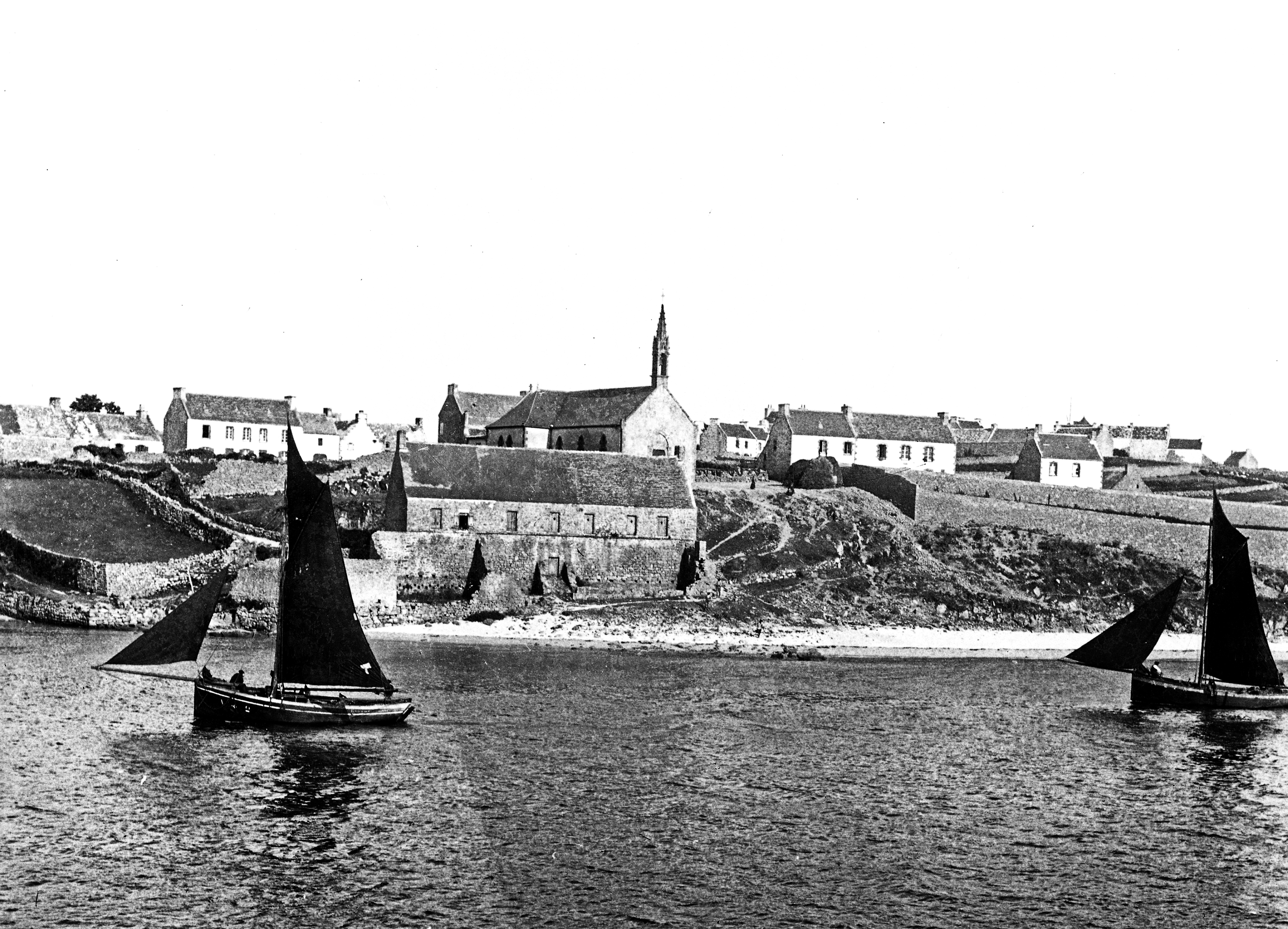 Vue générale prise d'Audierne. (Vue sur le clocher d'origine avant sa modification). Repro plaque de verre J. de Thézac, 1er quart du 20e siècle.Immatriculation