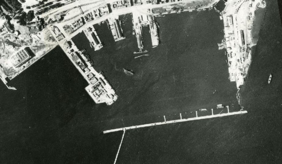 Vue aérienne, port de Brest, digue sud, 1944 : appontements et ducs d'albeImmatriculation