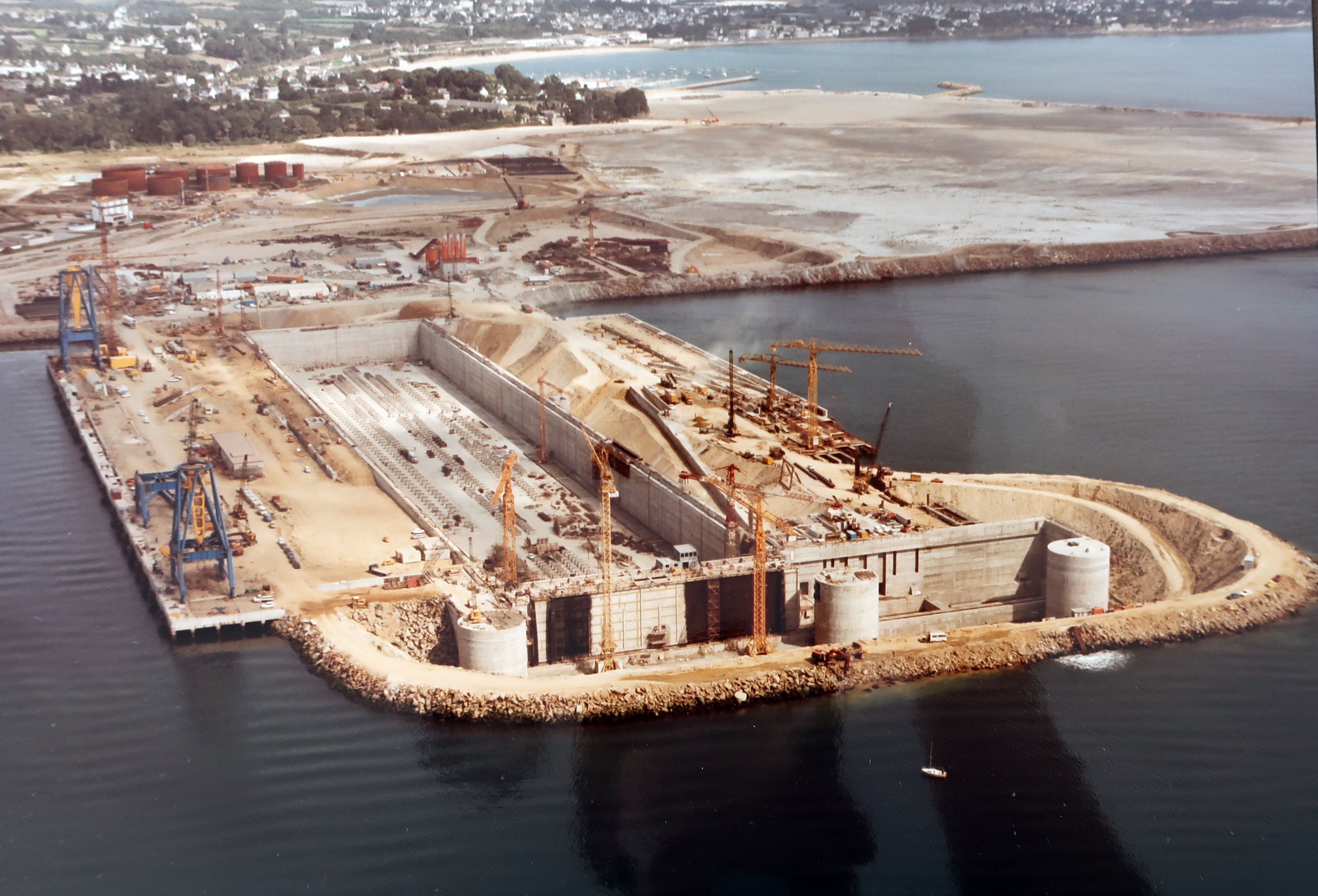 Installation des grues sur le QR4, radier et bajoyers de la forme, lignes de tins, têtes de forme avec emplacement du garage du bateau-porte, QR5 en cours de construction (septembre 1979)Immatriculation