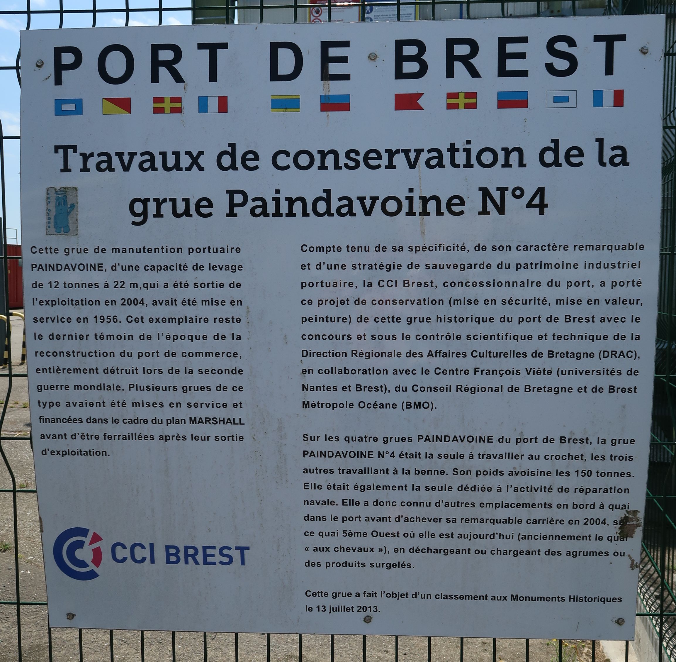 Panneau présentation des travaux de conservation de la grue, rédaction CCI de BrestImmatriculation