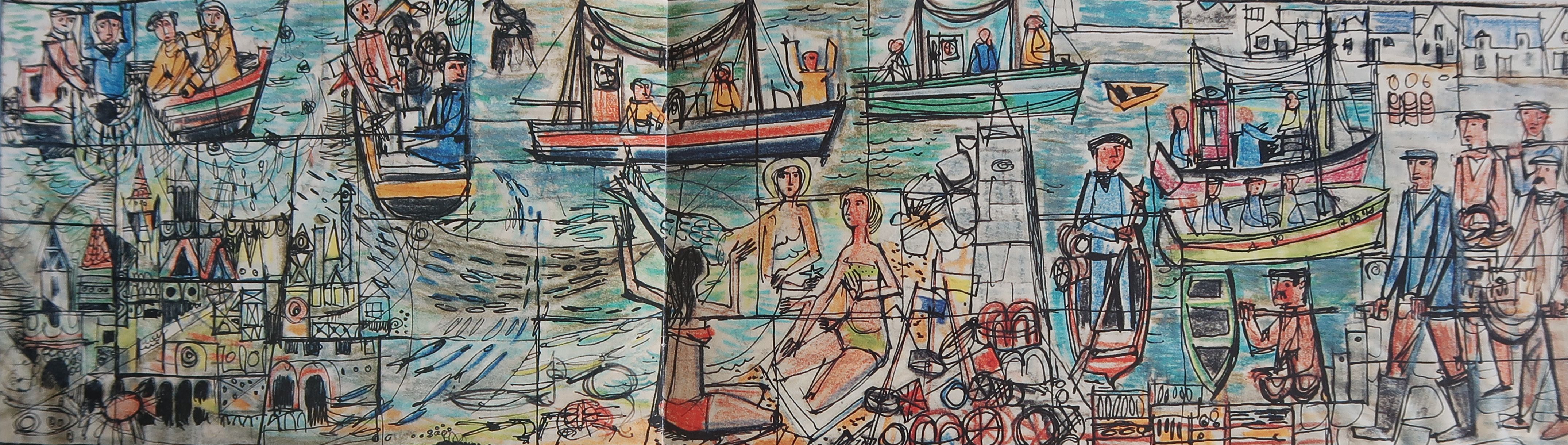 Maquette de Pierre Toulhoat pour le bas-relief "Armor", 1962. Les jeunes femmes en bikinis ont disparu du bas-relief installé dans le lycée tandis que d'autres intentions qui ont été réalisées, bien que traitées différemment (cité d'Ys, bateaux de pêche, scènes de port...).Immatriculation