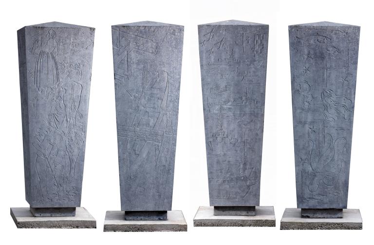 Montage photographique permettant de voir ensemble les quatre faces de la sculpture qui représente l'agriculture bretonne, le milieu marin, la Marine nationale et la construction navale très présentes à Brest. Marcel Renard, sculpteur, vers 1961.Immatriculation