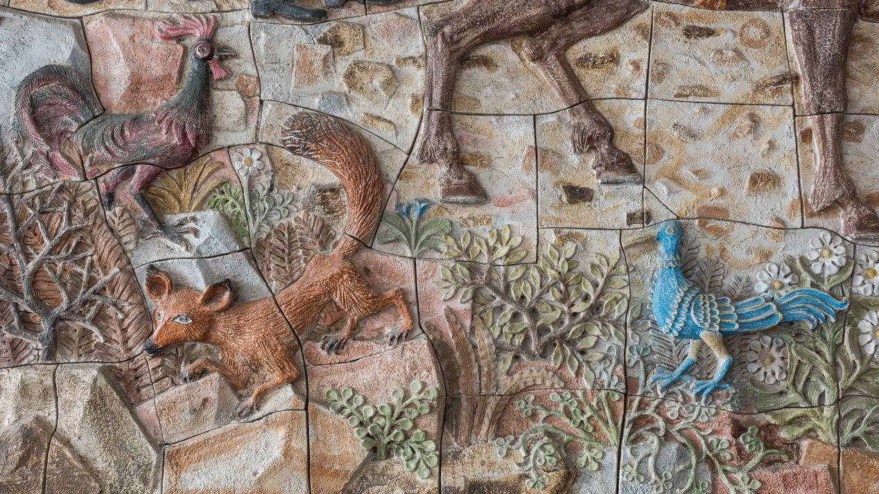 "Argoat", bas-relief en céramique de Quimper de Pierre Toulhoat, 1971 : détail sur la faune. Noter la présence d'un oiseau de paradis.Immatriculation