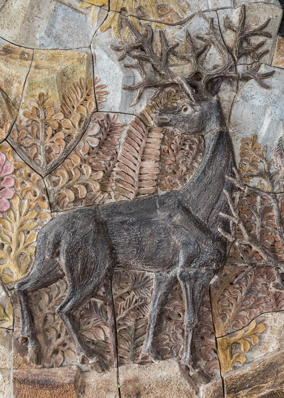 "Argoat", bas-relief en céramique de Quimper de Pierre Toulhoat, 1971 : détail sur le cerf.Immatriculation