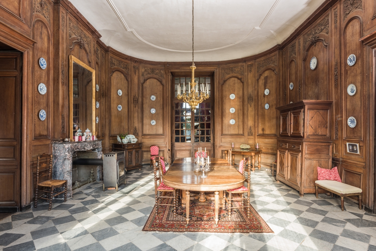 La salle à manger depuis le sud, dallage de marbre et boiseries de chêne naturel, glace et armoire malouineImmatriculation