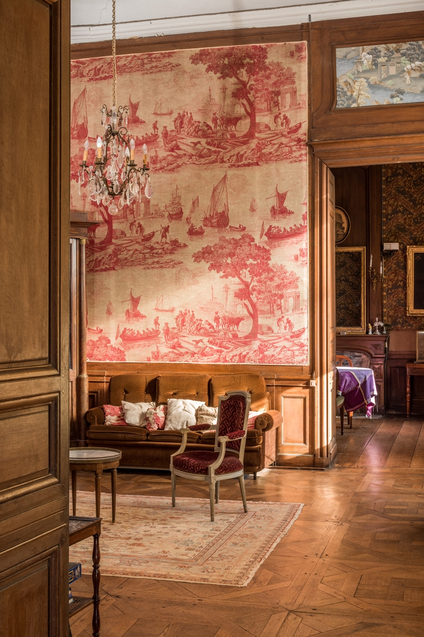 Vue intérieure, mur encollé d'une 'indienne' inspirée d'une oeuvre de Joseph Vernet (1714-1789), 'L'Entrée du port de Marseille', chinoiserie en imposteImmatriculation