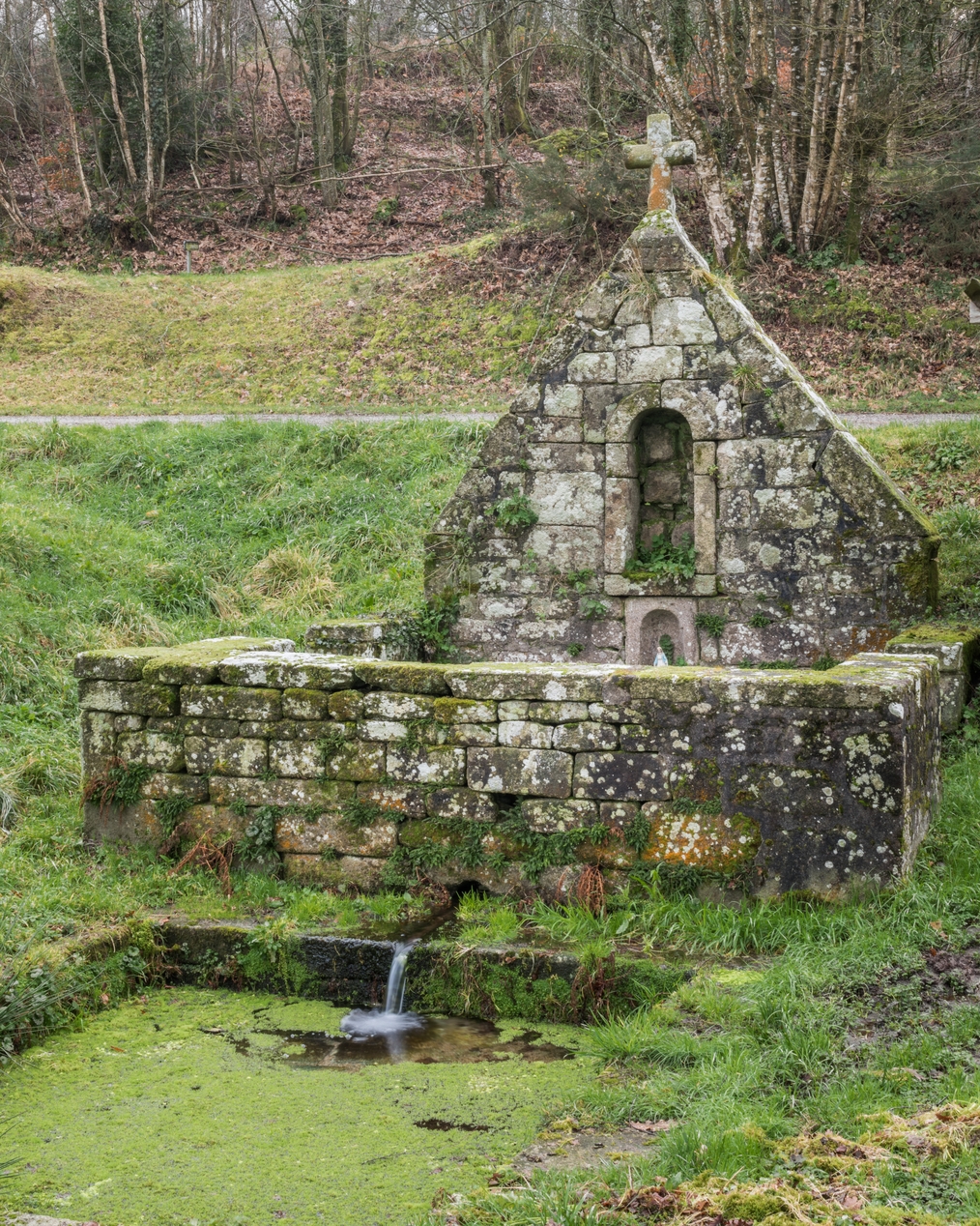 Vue de la fontaine Saint-Meldéoc et de son bassin d'écoulement à l'extérieur de son muret d'enceinteImmatriculation