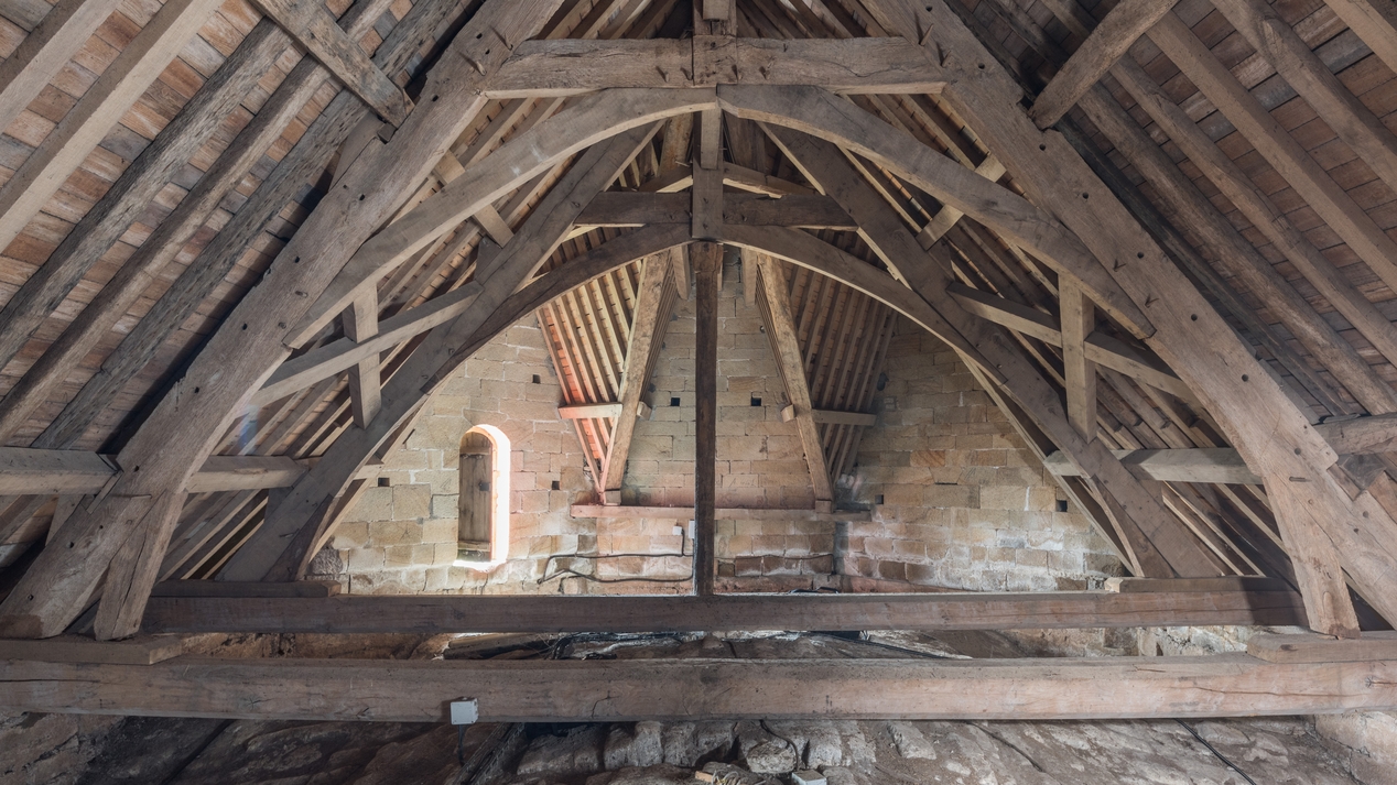 Vue de la charpente du choeur depuis l'ouest.Immatriculation