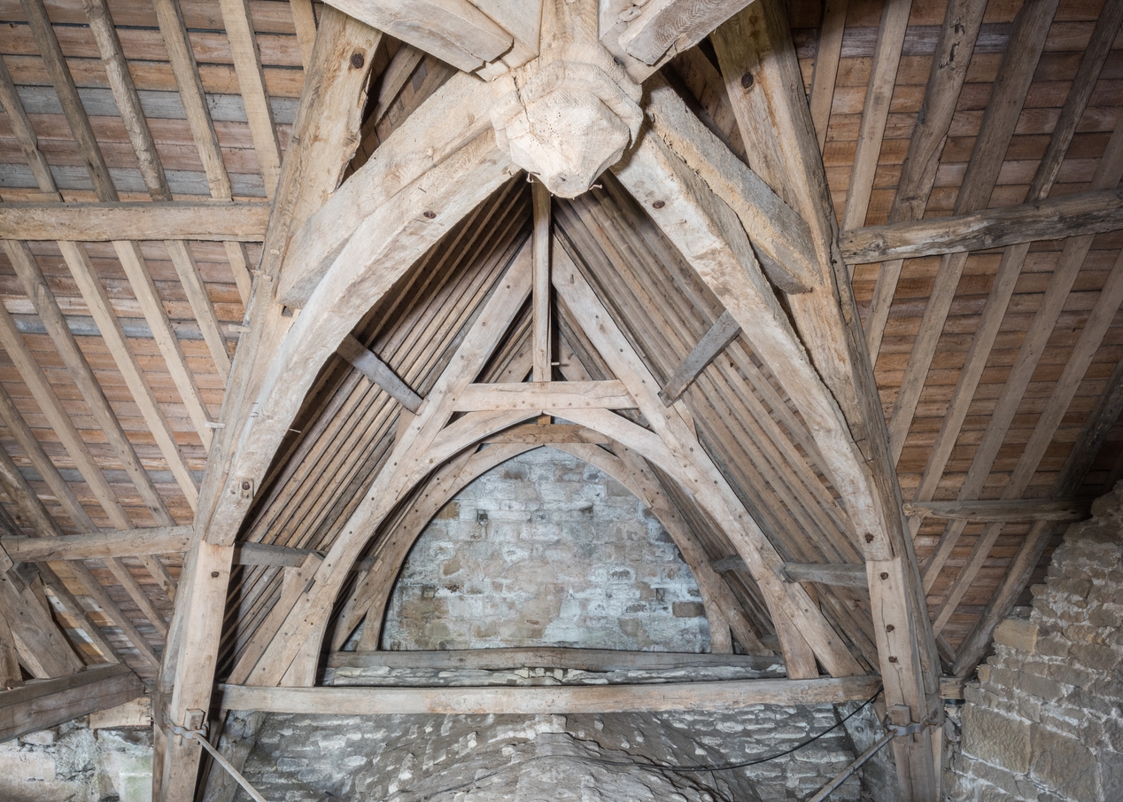 Vue de la clef de voûte de la charpente à la croisée du transept et de la charpente du bras sud du transept.Immatriculation