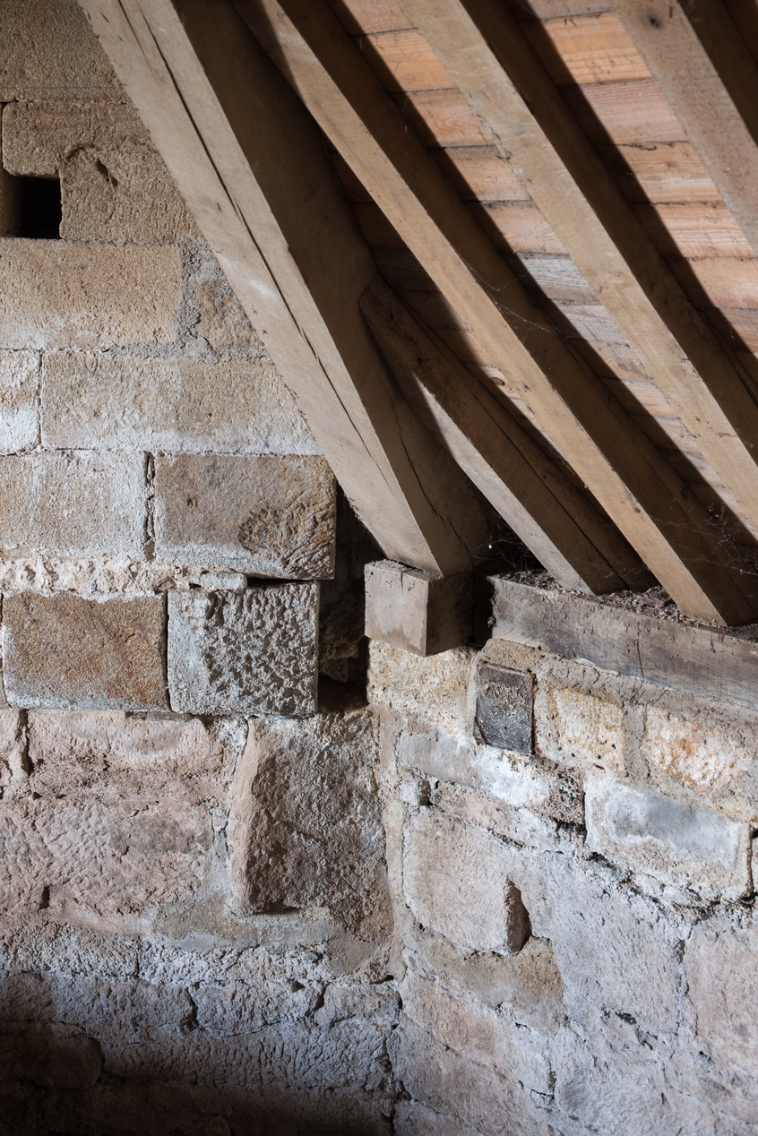 Vue de détail : jonction des maçonneries de l'abside à trois pans (à gauche) et du mur sud de la travée droite du choeur (à droite).Immatriculation