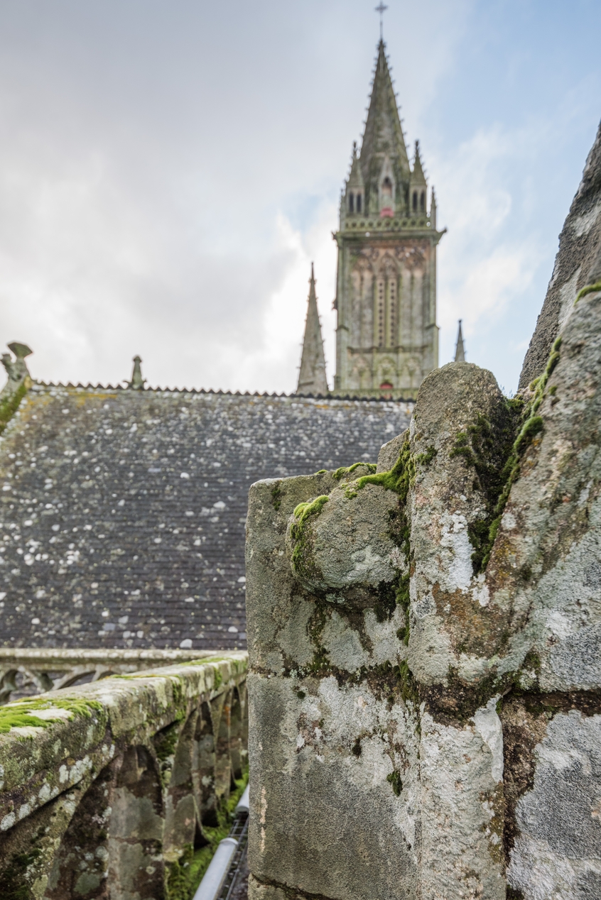 Vue de détail : vestige d'un écoulement d'une ancienne toiture et du pinacle qui le surmontait, à la jonction sud entre la travée droite du chevet et l'abside.Immatriculation
