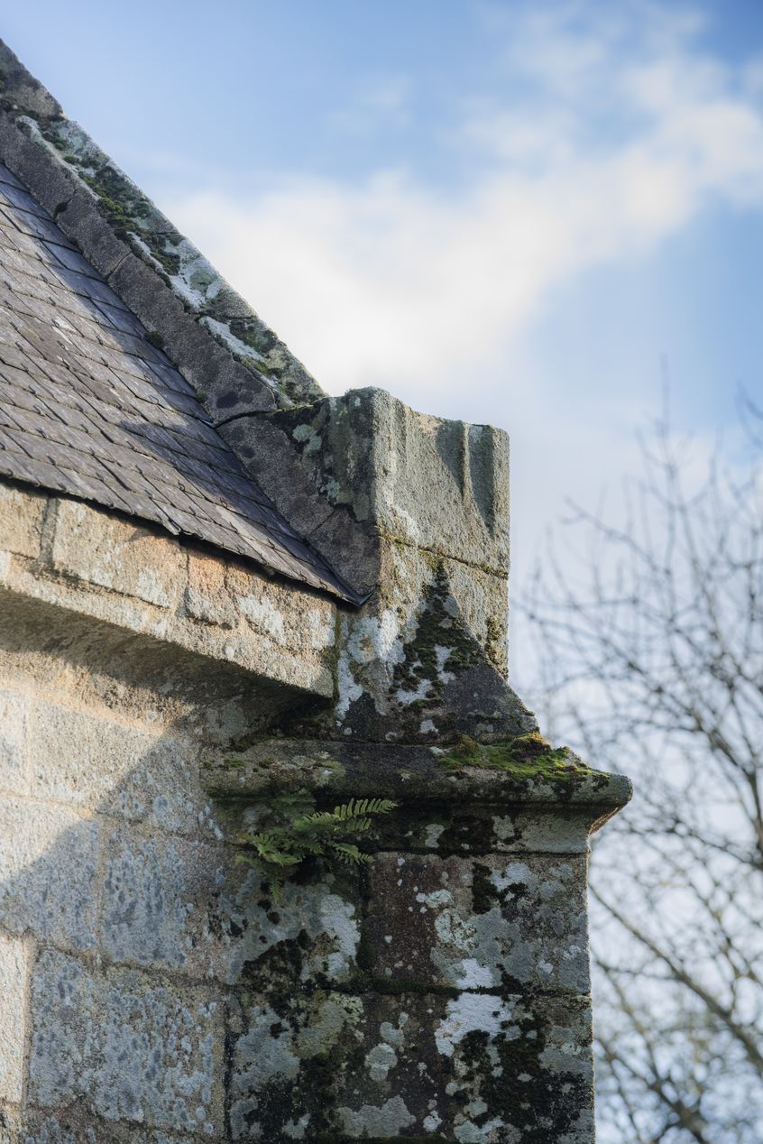Vue de détail : contrefort et son pinacle tronqué à l'angle sud-est de la chapelleImmatriculation