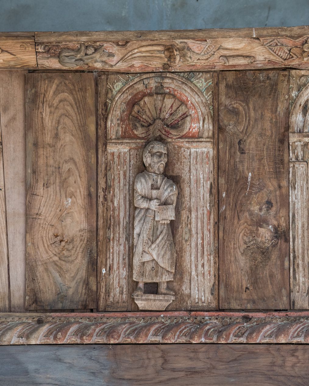 Vue de détail : panneau de la tribune sculpté en bas-relief représentant saint SimonImmatriculation