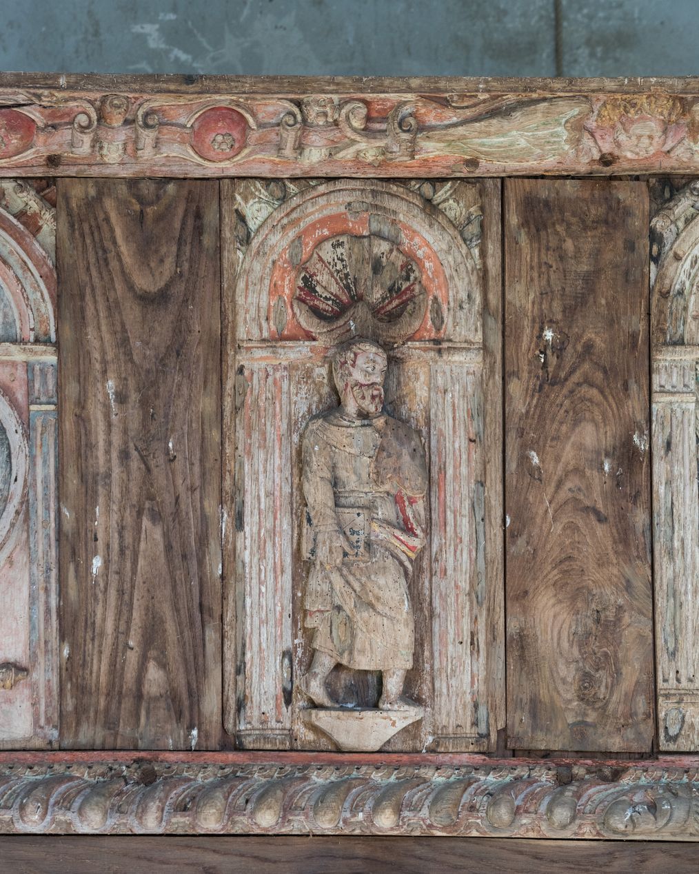 Vue de détail : panneau de la tribune sculpté en bas-relief représentant un apôtre (?)Immatriculation