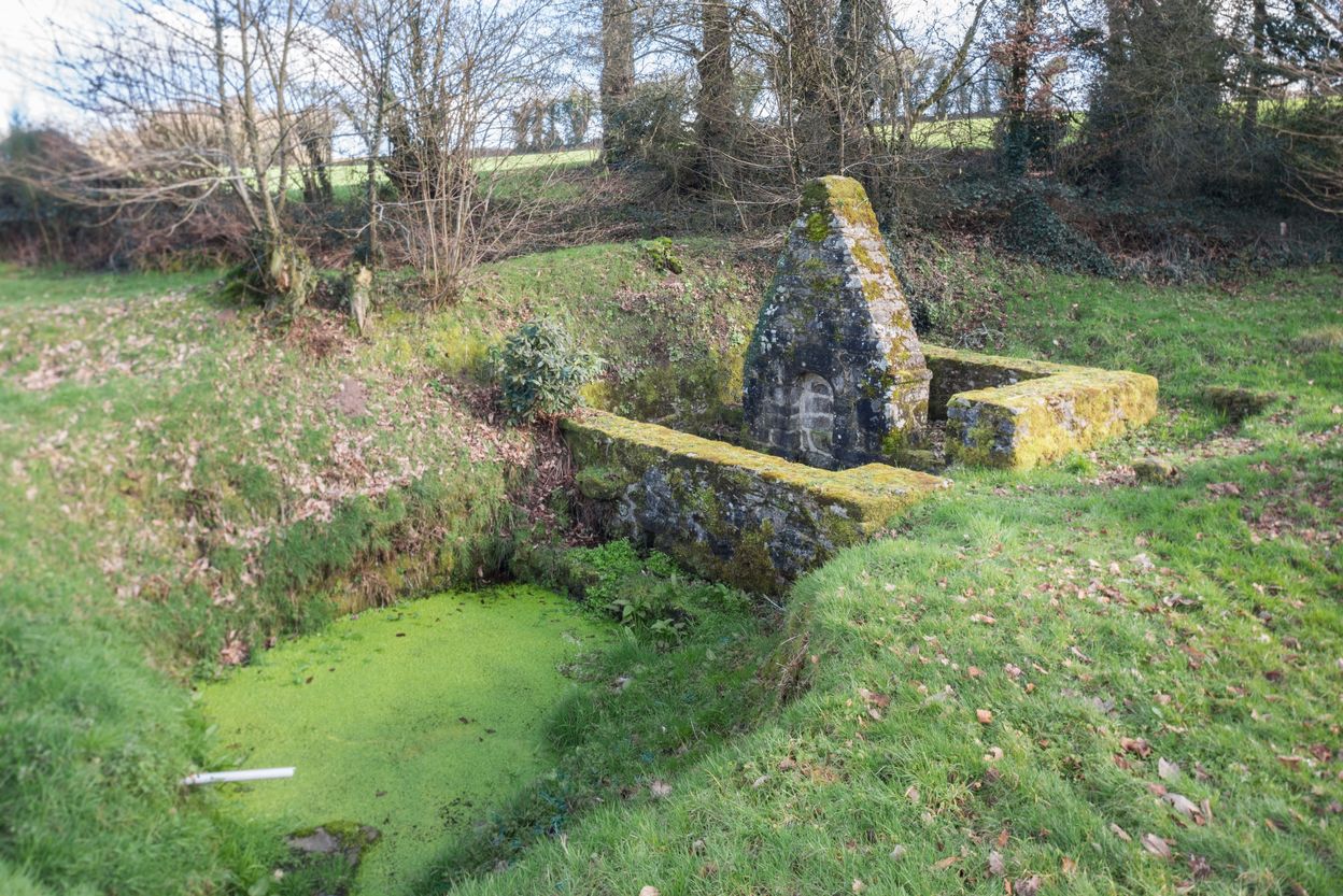 Vue de la fontaine Saint-Salomon, située sur le côté de la route en contrebas du piton rocheuxImmatriculation