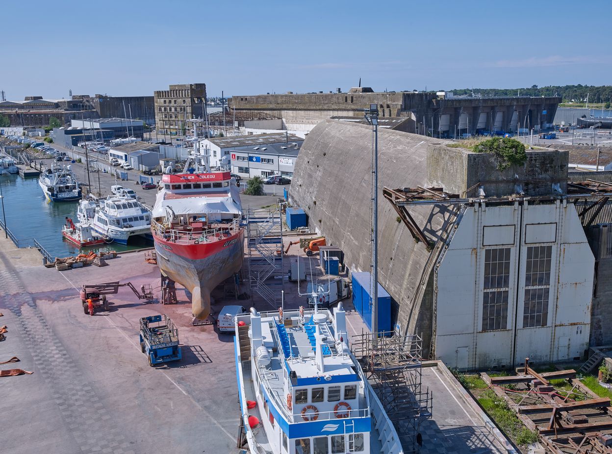 Vue de situation depuis le sommet de l'élévateur à bateaux de l'aire de réparation navale. Sur le terre-plein, des chalutiers en maintenanceImmatriculation