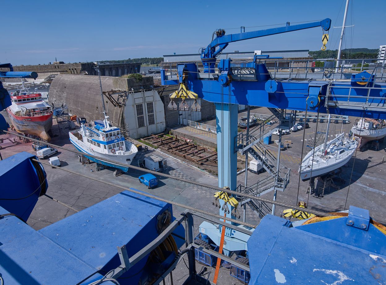 Vue de situation depuis le sommet de l'élévateur à bateaux de l'aire de réparation navaleImmatriculation