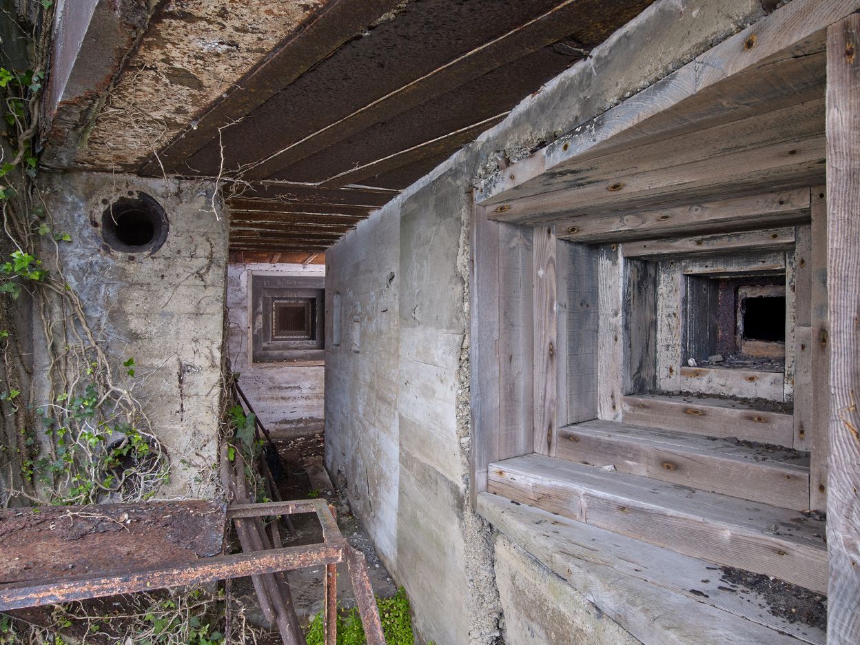 Vue de l'embrasure de la caponnière. Elle est revêtue en bois avec un profil anti-ricochet en gradin (Trepenscharte). Au centre, la seconde embrasure correspond à la défense de l'entrée. Sur les murs, des graffitis de soldats de toute époqueImmatriculation