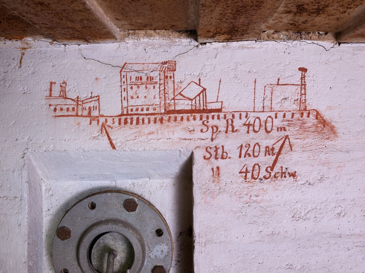 Vue du panorama de tir avec repère de distance pour la mitrailleuse. Au centre, on reconnaît le bâtiment frigorifique dit la glacière de Lorient. Sous le dessin, bouche de surpression à clapetImmatriculation