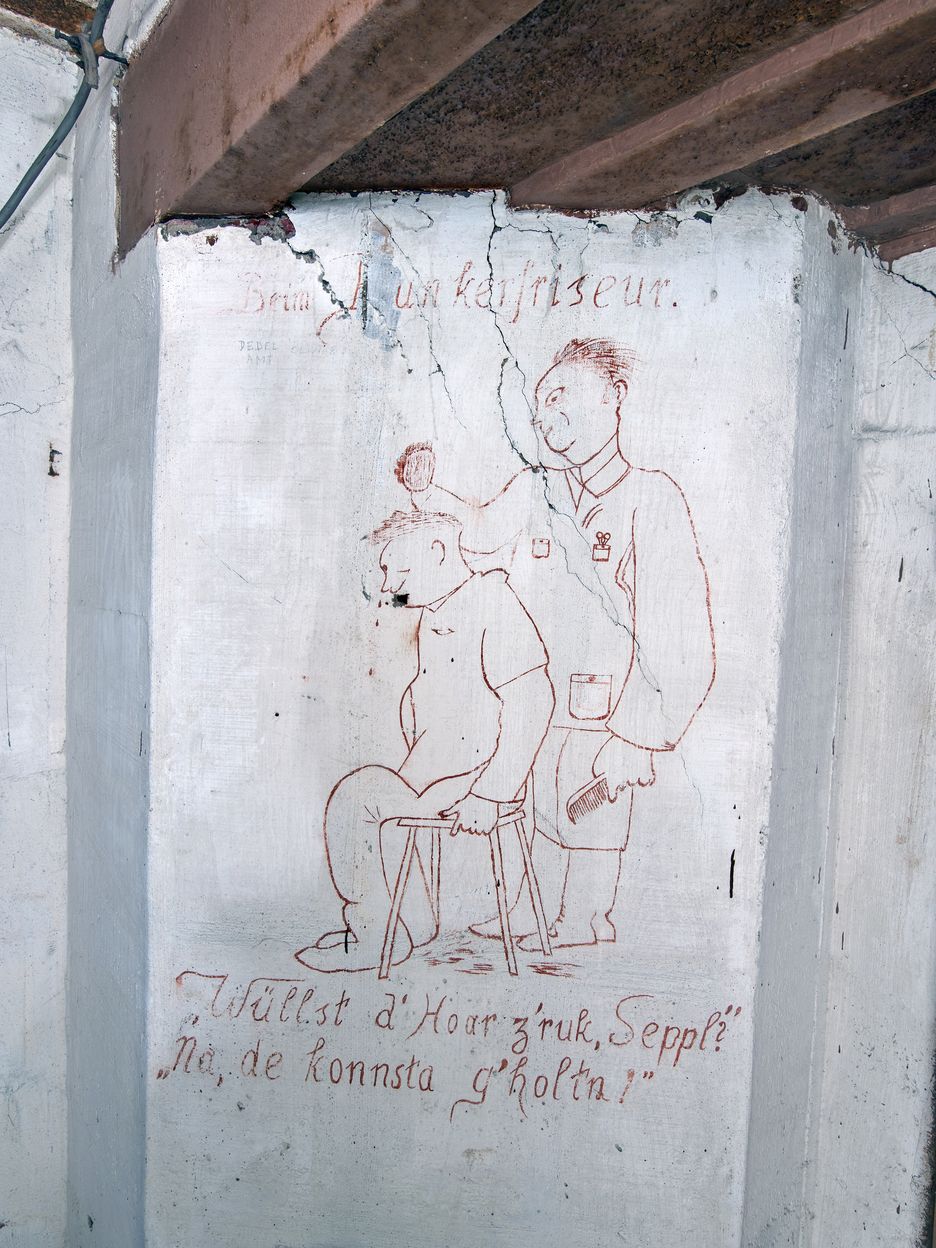 Vue de l'une des deux peintures murales situées dans le couloir : un soldat un peigne et une brosse à la main coiffant les cheveux d’un soldat assis sur un tabouret, Beim [B]unkerfriseur. / Wüllst d’Hoar z’ruk, Seppl ? / Na, de konnsta g’holtn !, Chez le coiffeur du bunker : Veux-tu que je te refile tes cheveux, Jojo ? / Non, tu peux les garder !Immatriculation