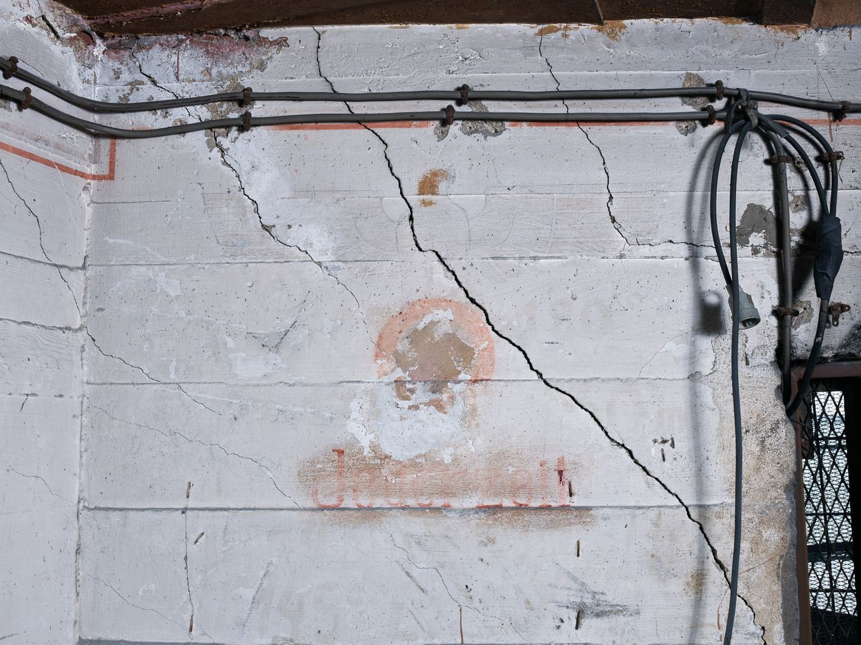Vue de l'une des deux peintures de propagande nazie dans la chambre de combat du canon (partie gauche) : aigle impérial du Troisième Reich (très effacé) et croix gammée (martelée) accompagnés du cri de guerre Jederzeit, à tout momentImmatriculation