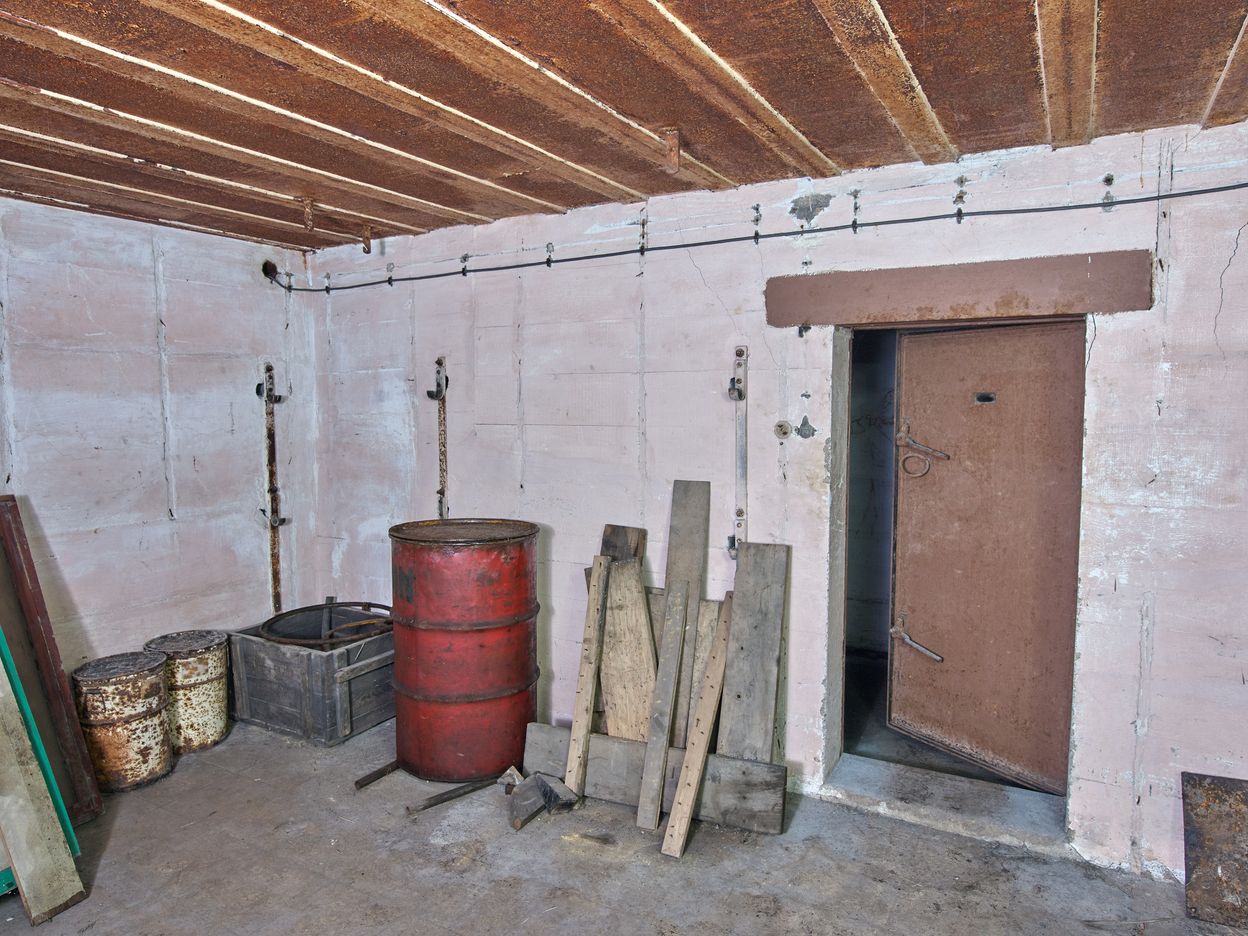 Vue de la pièce de vie de l'équipage du bunker : porte étanche. Au plafond et sur les murs, crochets pour la suspension des couchettes tubulairesImmatriculation