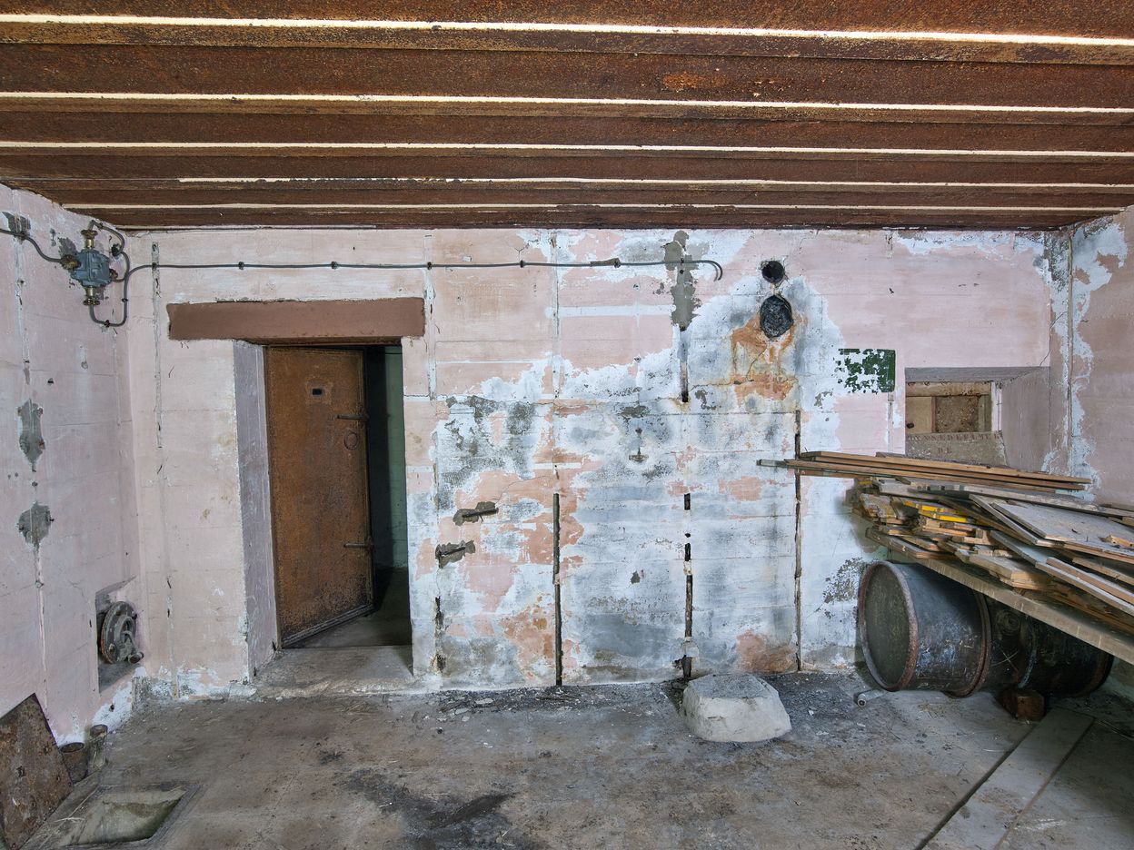 Vue de la pièce de vie de l'équipage du bunker : porte étanche à gauche ; au sol, créneau de surpression à contrepoids et, à droite, créneau blindé de défense d'entrée/sortieImmatriculation