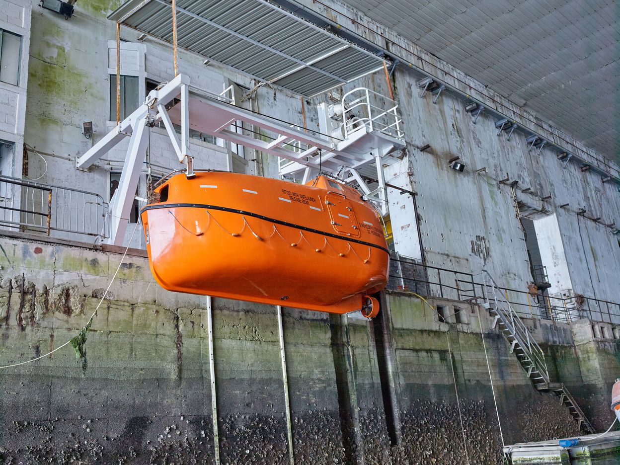 Vue de l'alvéole E (n° 17 et 18) : quai ouest n° 18. Cette alvéole est utilisée pour l'entraînement à la survie en mer par le Centre d'Étude et de Pratique de la Survie de Lorient. Ici, une chaloupe de sauvetage suspendueImmatriculation