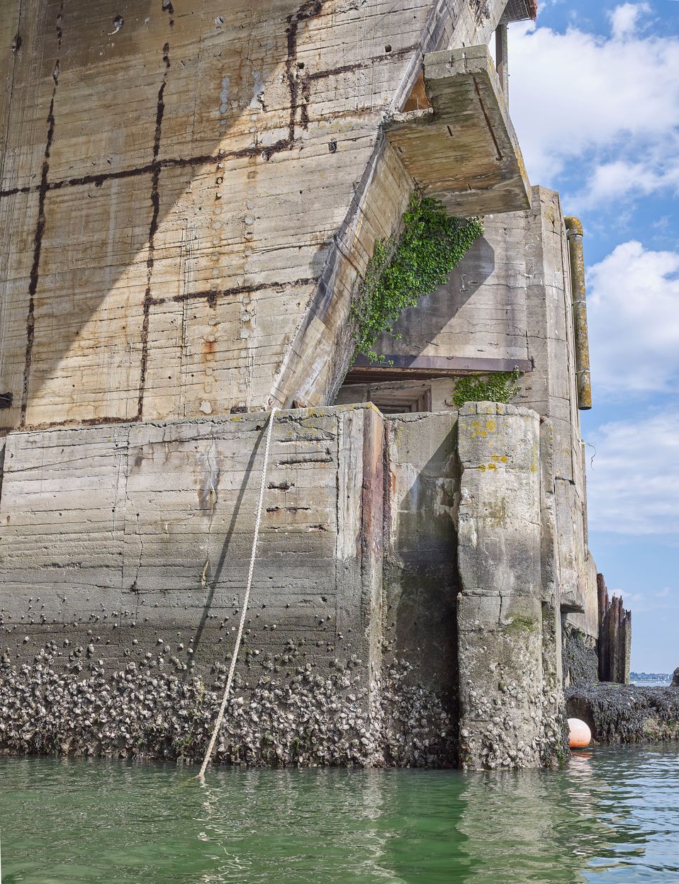Vue de l'entrée de l'alvéole G (n° 13 et 14) : contrefort du mur latéral. Une casemate pour mitrailleuse - dont l'embrasure est partiellement visible ici - protége les approches de la base de sous-marinsImmatriculation