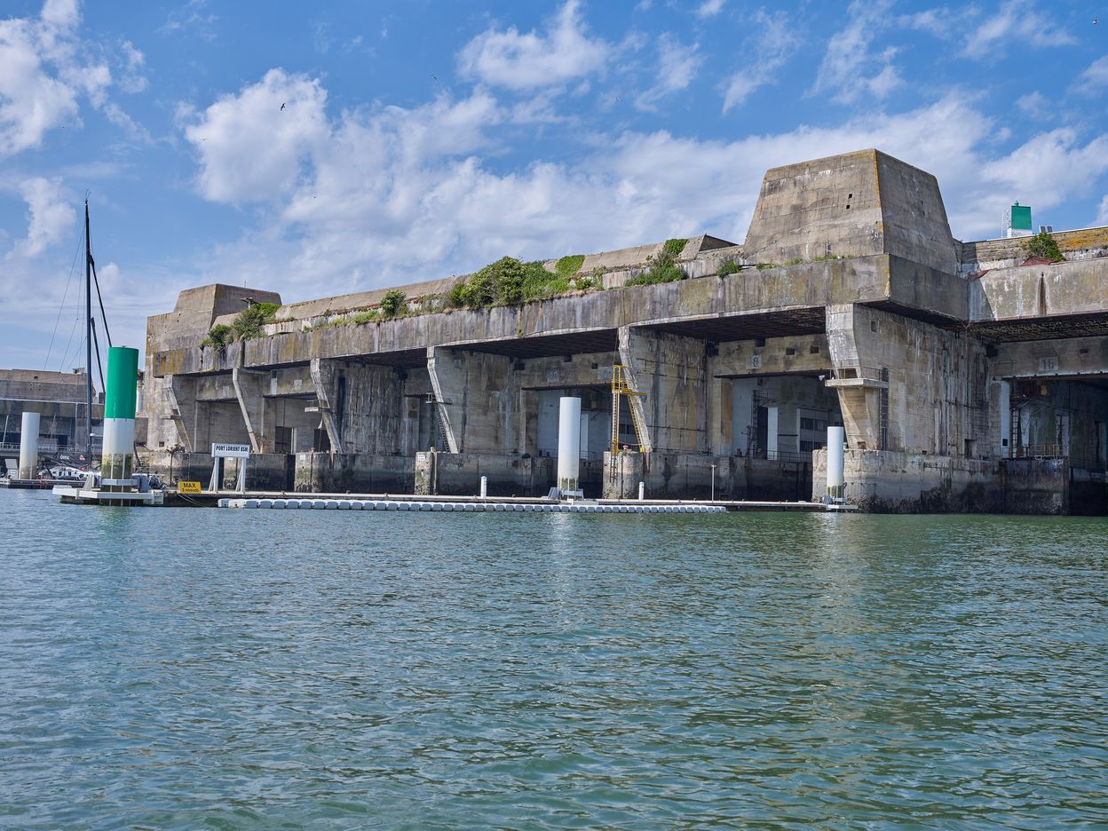 Vue générale depuis la rade de Lorient : entrée de cinq des sept alvéoles. Au premier plan : pontons de navires de course au largeImmatriculation