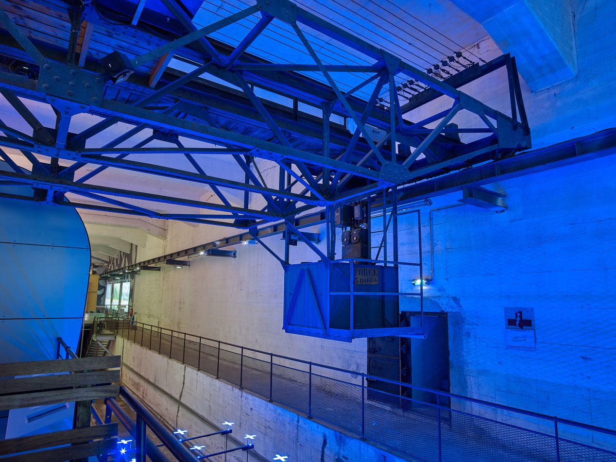 Vue du pont roulant allemand et voie de roulement dans l'alvéole "K6a". A l'arrière-plan, l'entrée du parcours muséalImmatriculation