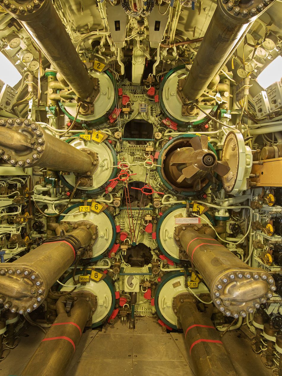 Vue intérieure du sous-marin Flore : ensemble de huit tubes lance-torpilles à l'avantImmatriculation
