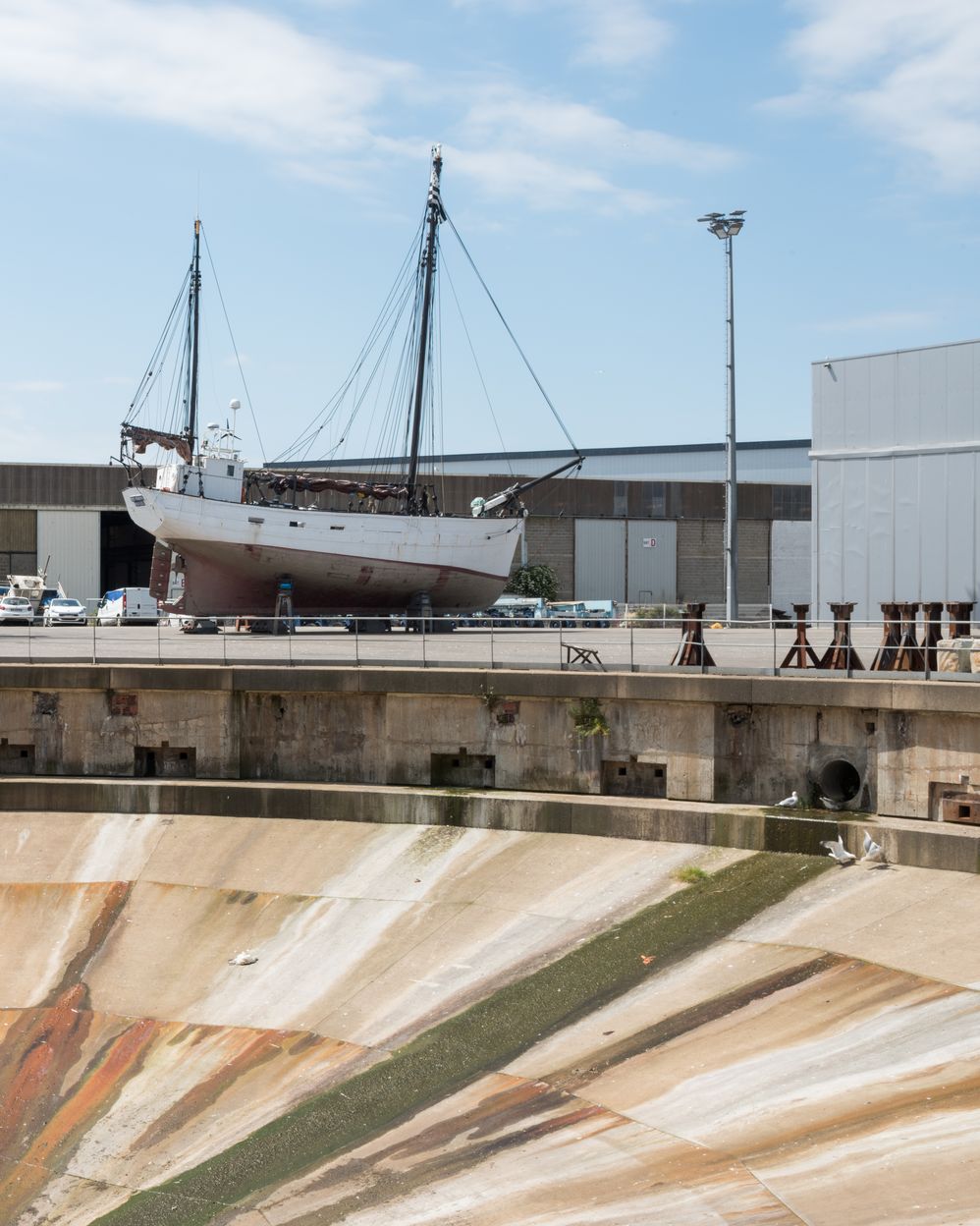 Vue de la fosse du slipway. En arrière plan, bateau de pêche à voile et moteurImmatriculation