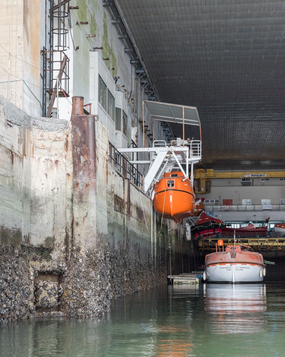 Vue de l'alvéole E (n° 17 et 18) : quai ouest n° 18. Cette alvéole est utilisée pour l'entraînement à la survie en mer par le Centre d'Étude et de Pratique de la Survie de Lorient. Ici, deux chaloupes de sauvetage de type baleinièreImmatriculation