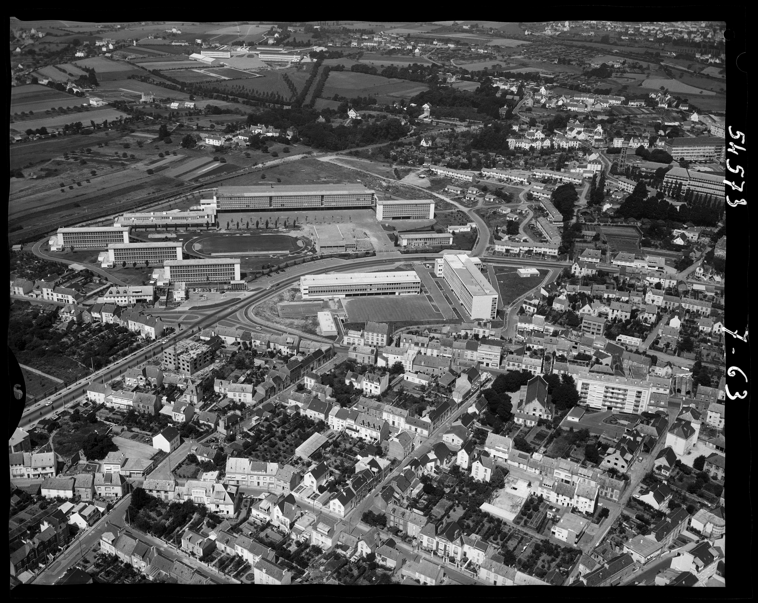 Musée de Bretagne (Rennes) : 971.0037.4573. Heurtier, Vue aérienne du lycée Colbert et du lycée Marie-Le-Franc, juillet 1963.