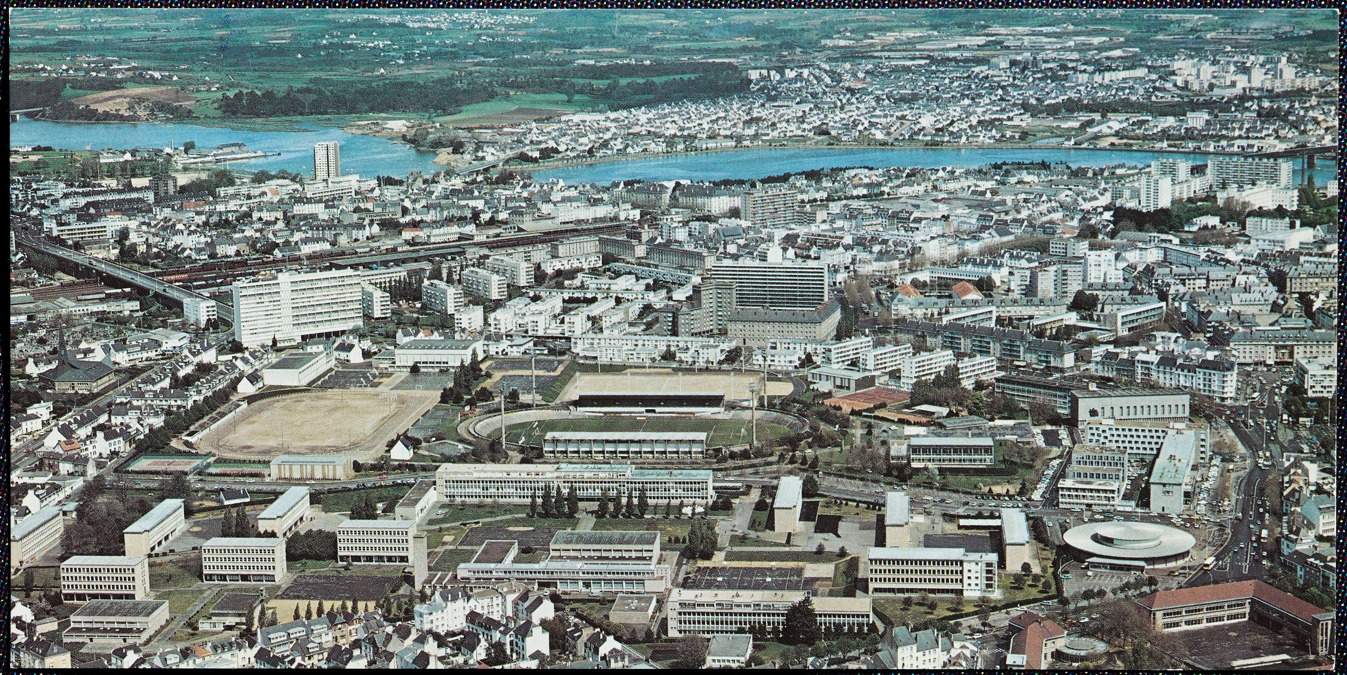 Vue aérienne du lycée Dupuy-de-Lôme. Carte postale Ruyant production, Paris, Sd (vers 1976) (Archives du lycée). Au cœur de la ville dense, un urbanisme aéré et très vert. Cette vue permet de mesurer la taille imposante du lycée sur ses 8ha de surface.Immatriculation