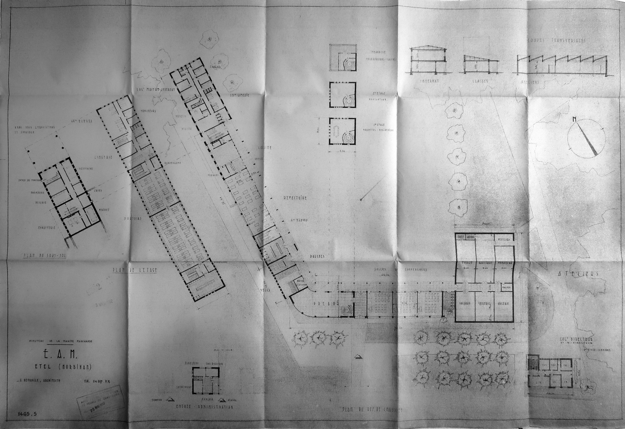 Plans de l'E.A.M. (école d'apprentissage maritime) - Etel. Jacques Deyrolle, architecte, 23 mai 1952.Immatriculation