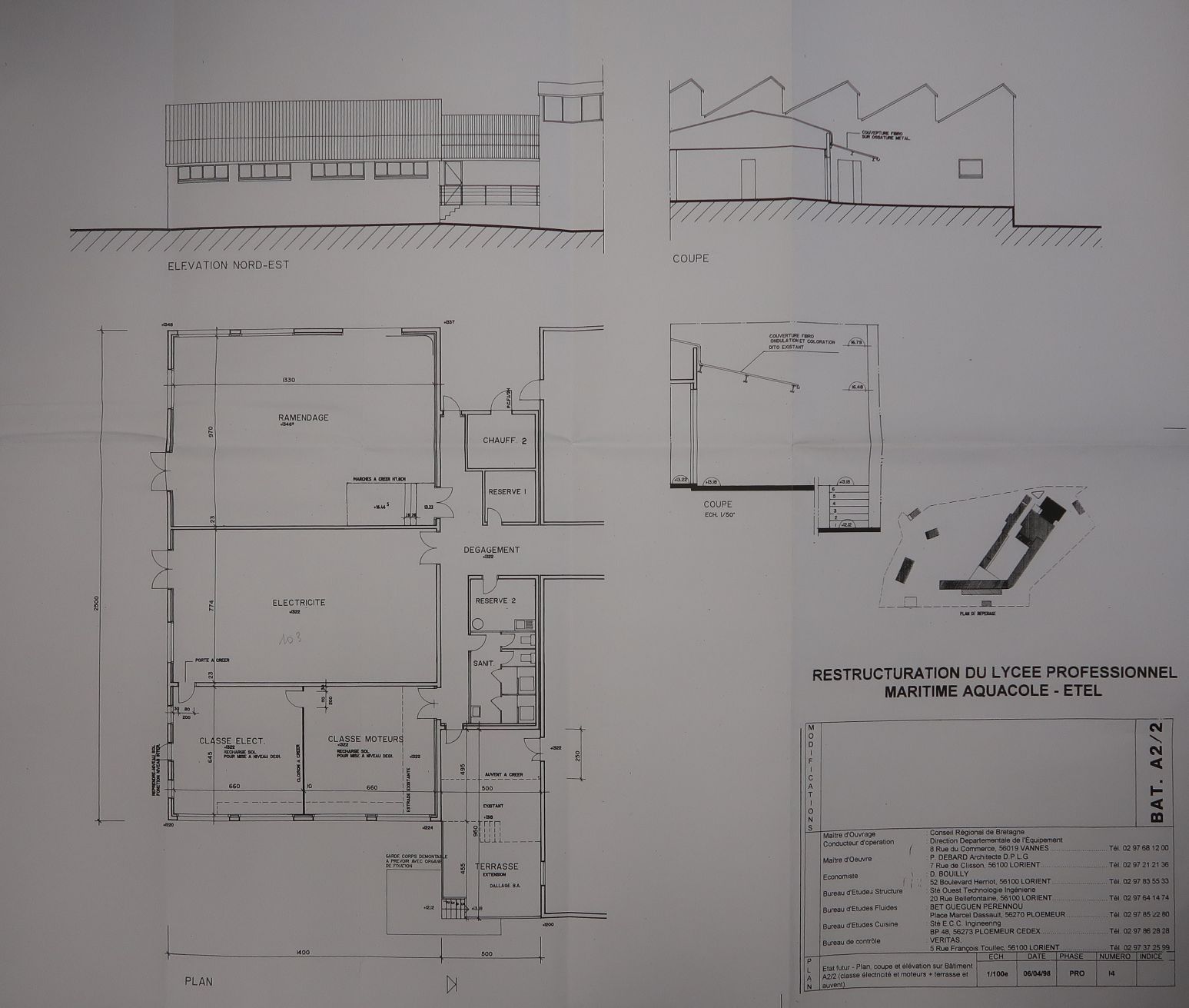 Restructuration du bâtiment A2, trois salles de travaux pratiques de 1985 : maintien des classes d'électricité et de ramendage, remplacement de la salle de conchyliculture de 1985 par une classe électricité et une classe moteurs. Pascal Debard, architecte, 1998-1999.Immatriculation