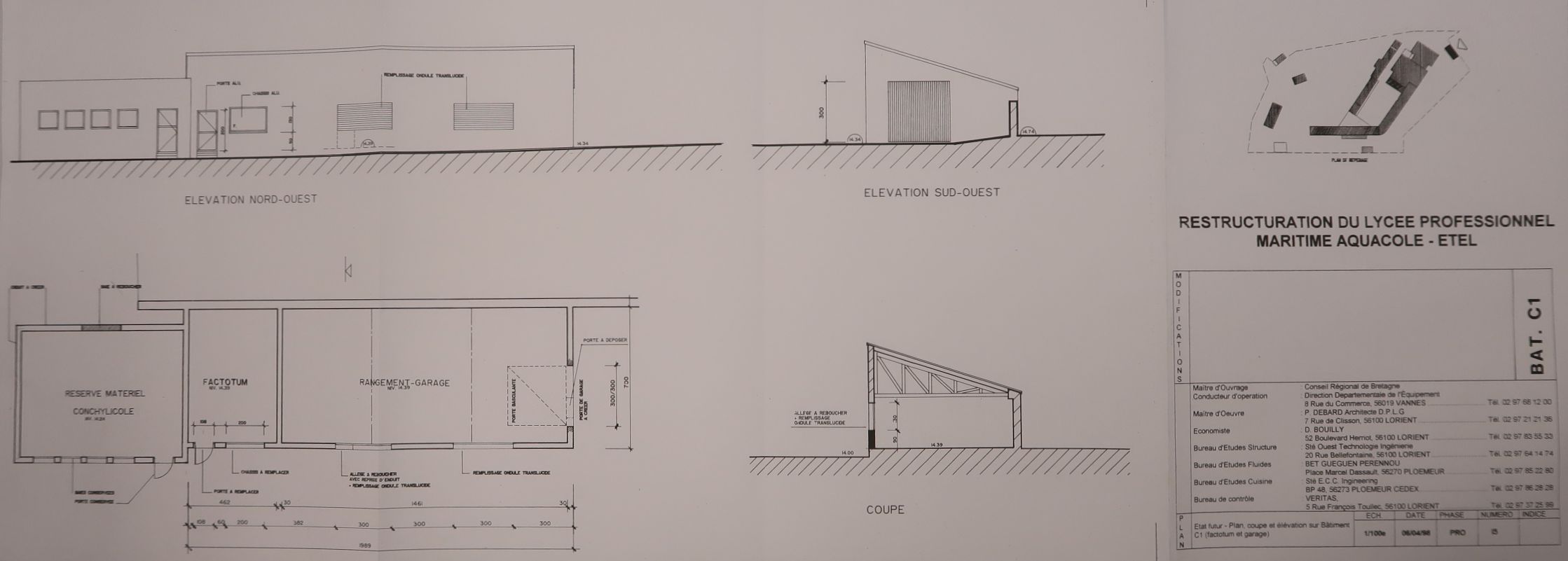 Restructuration du bâtiment C (rangement, réserves, factotum) : plan et façades. Pascal Debard, architecte, 1998-1999.Immatriculation