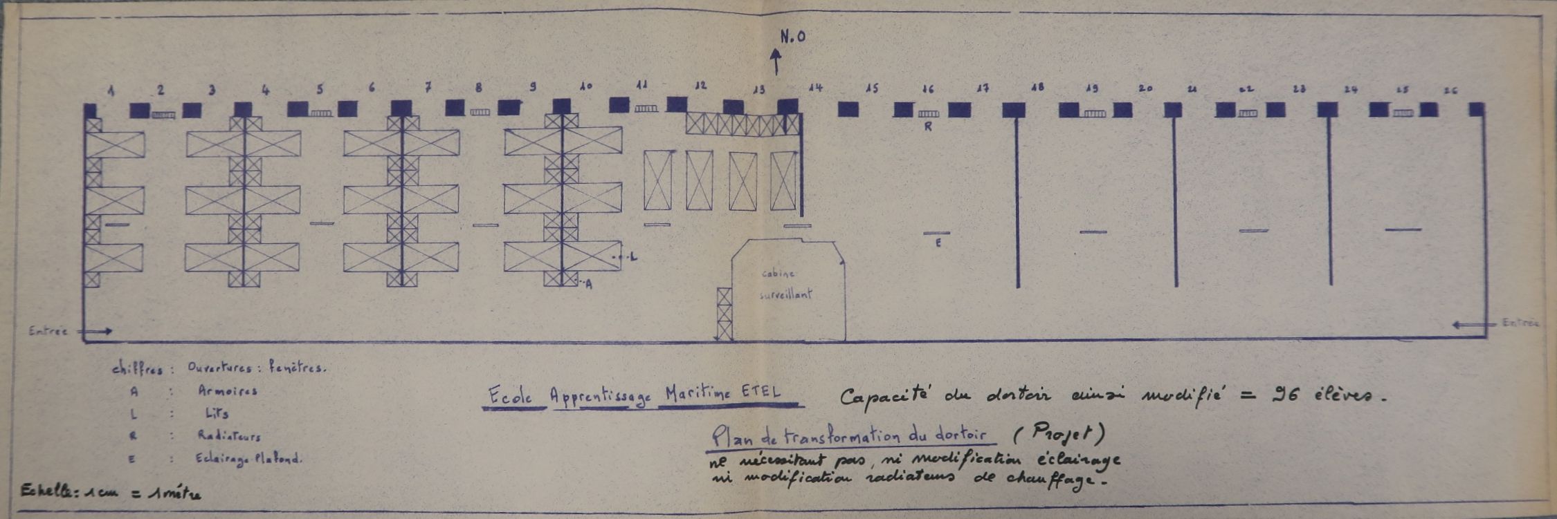 Projet de modification du dortoir, pour en accroitre la capacité et introduire un peu de cloisonnement. Sans non ni date.Immatriculation