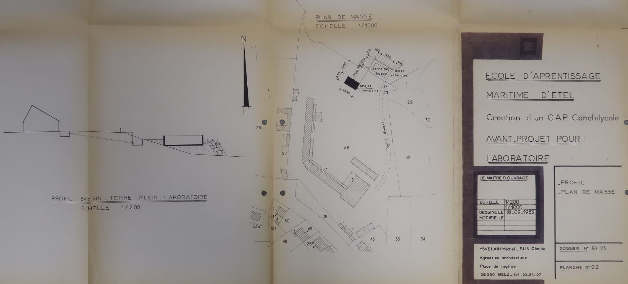 Avant projet de construction d'un laboratoire et d'un bassin pour le CAP de conchyliculture : plan de masse et profil. Michel Ysvelain et Claude Blin, architecte, 1983.Immatriculation