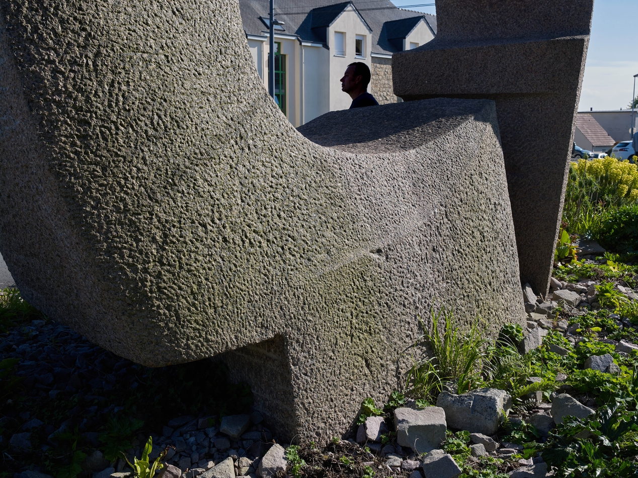 Sculpture en granite rose de Morice Lipsi "Dialogue de la Tangente et de la Verticale" (1972) : détail.Immatriculation