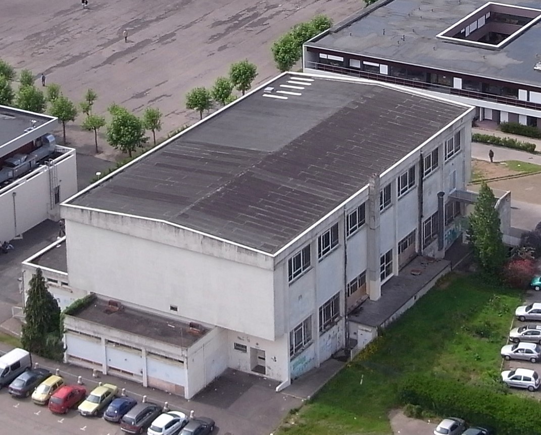 Vue aérienne oblique d'ensemble, prise du sud-est. Jean de Jaegher et François Roussseau, architectes, 1968.Immatriculation