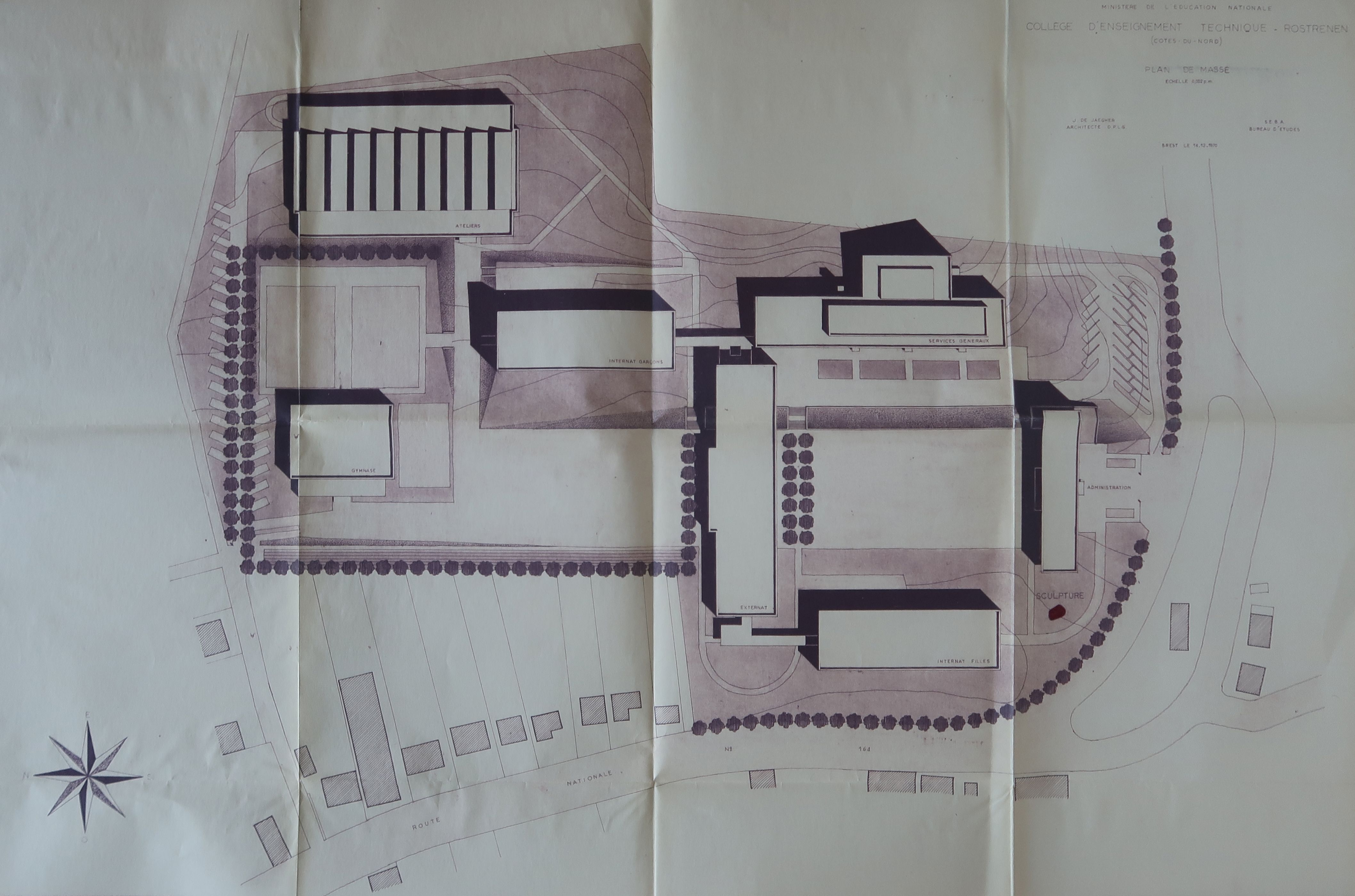 Collège d'enseignement technique de Rostrenen. Plan de masse. 14 décembre 1970. En rouge, l'emplacement projeté de la décoration au titre du 1% artistique. Jean de Jaegher, architecte.Immatriculation