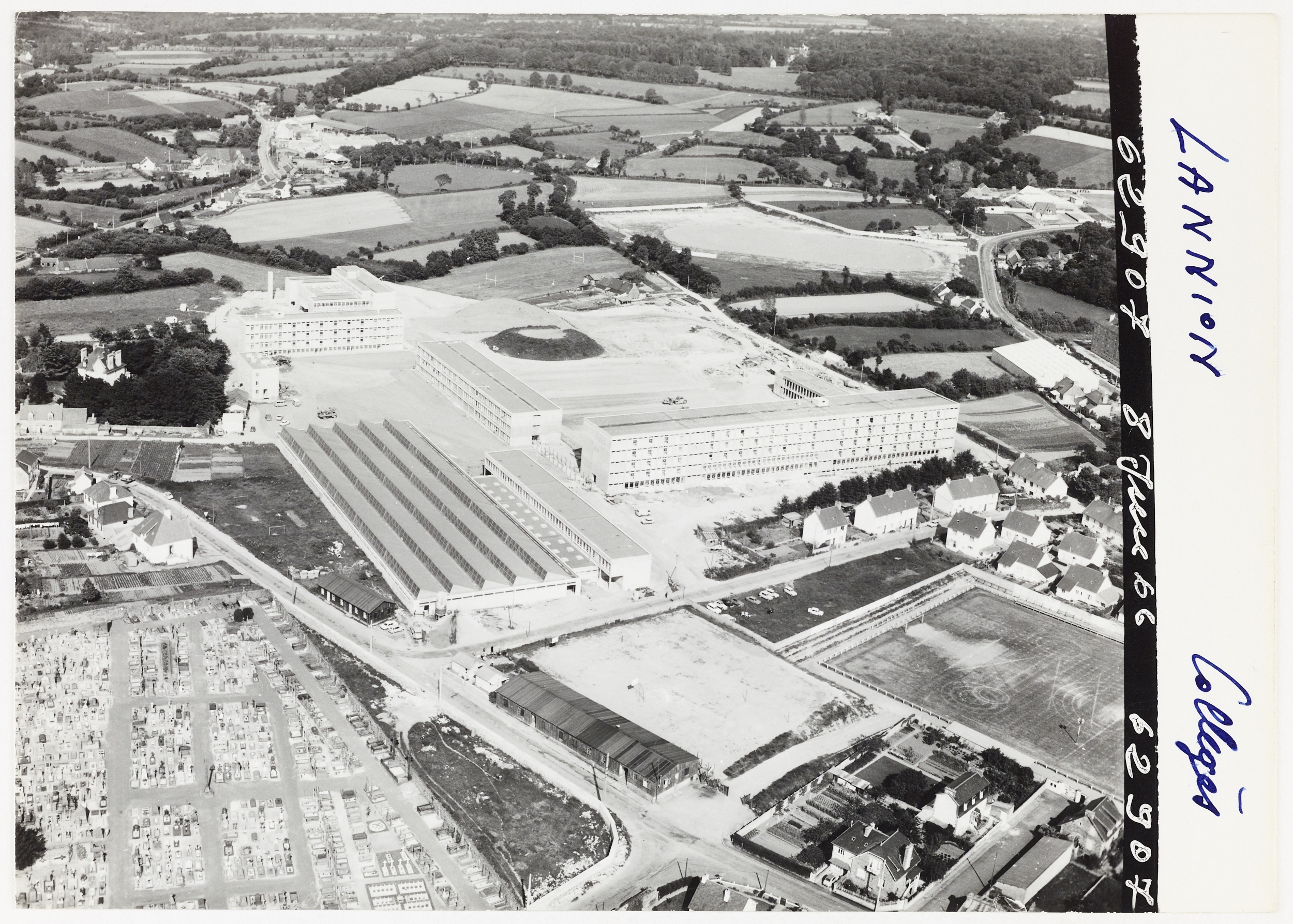 Musée de Bretagne (Rennes) : M0212_AG-971-37-9894-2-U ; M0212_AG-971-37-12375-2-U ; M0212_AG-971-37-9895-2-U ; M0212_AG-971-37-12299-2-U. Heurtier, Vue aérienne Heurtier : "Lannion, collèges et nouveau collège", 1966 et 1968