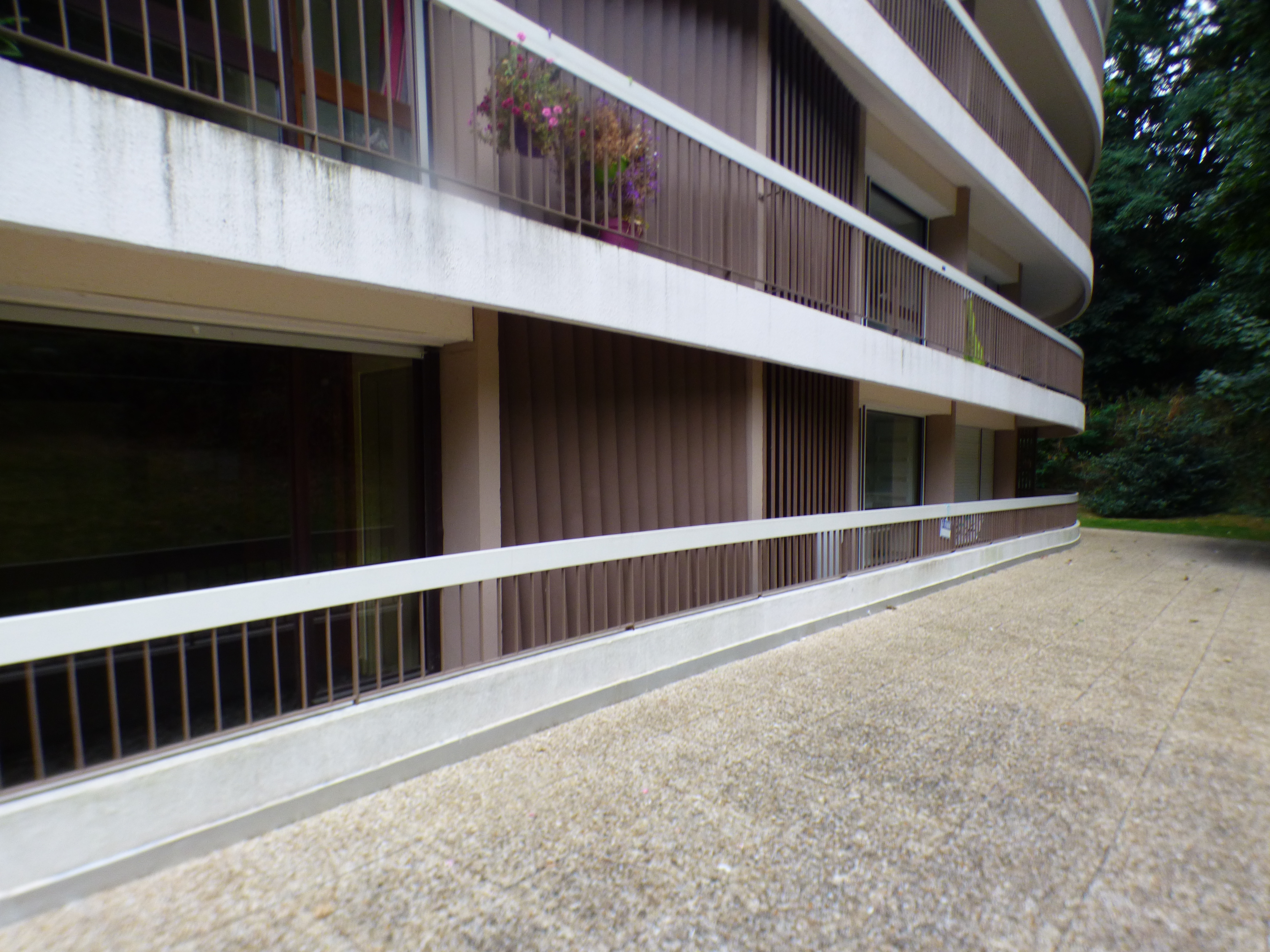 Vue des logements du rez-de-chaussée côté sud légèrement enterré pour s'intégrer dans la penteImmatriculation